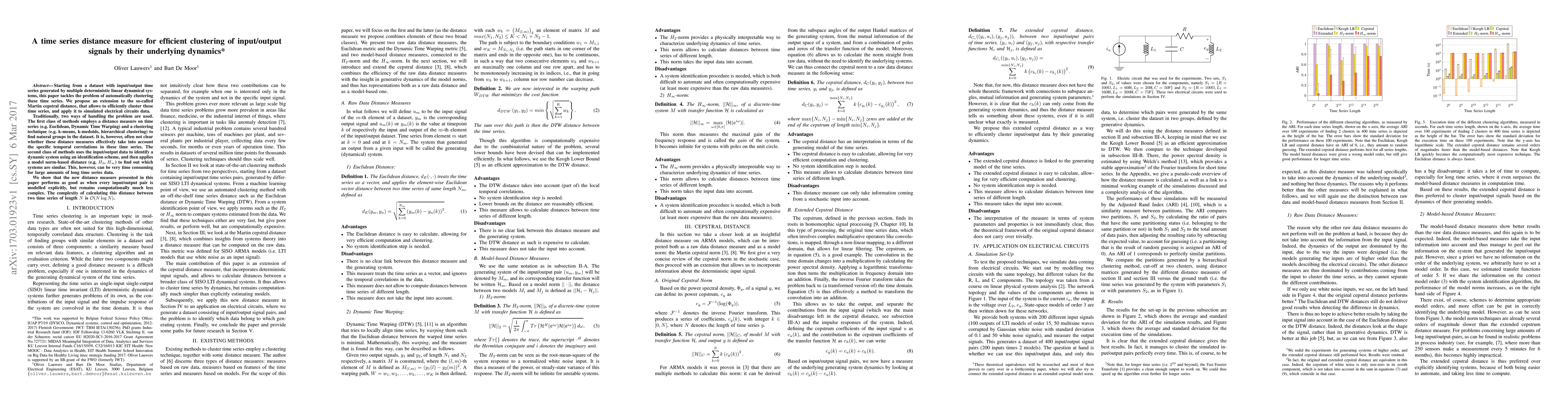 Starting from a dataset with input/output time series generated by multiple deterministic linear dynamical systems, this paper tackles the problem of automatically clustering these time series. We propose an extension to the so-called Martin cepstral distance, that allows to efficiently cluster these time series, and apply it to simulated electrical circuits data. Traditionally, two ways of handling the problem are used. The first class of methods employs a distance measure on time series (e.g. Euclidean, Dynamic Time Warping) and a clustering technique (e.g. k-means, k-medoids, hierarchical clustering) to find natural groups in the dataset. It is, however, often not clear whether these distance measures effectively take into account the specific temporal correlations in these time series. The second class of methods uses the input/output data to identify a dynamic system using an identification scheme, and then applies a model norm-based distance (e.g. H2, H-infinity) to find out which systems are similar. This, however, can be very time consuming for large amounts of long time series data. We show that the new distance measure presented in this paper performs as good as when every input/output pair is modelled explicitly, but remains computationally much less complex. The complexity of calculating this distance between two time series of length N is O(N logN).
