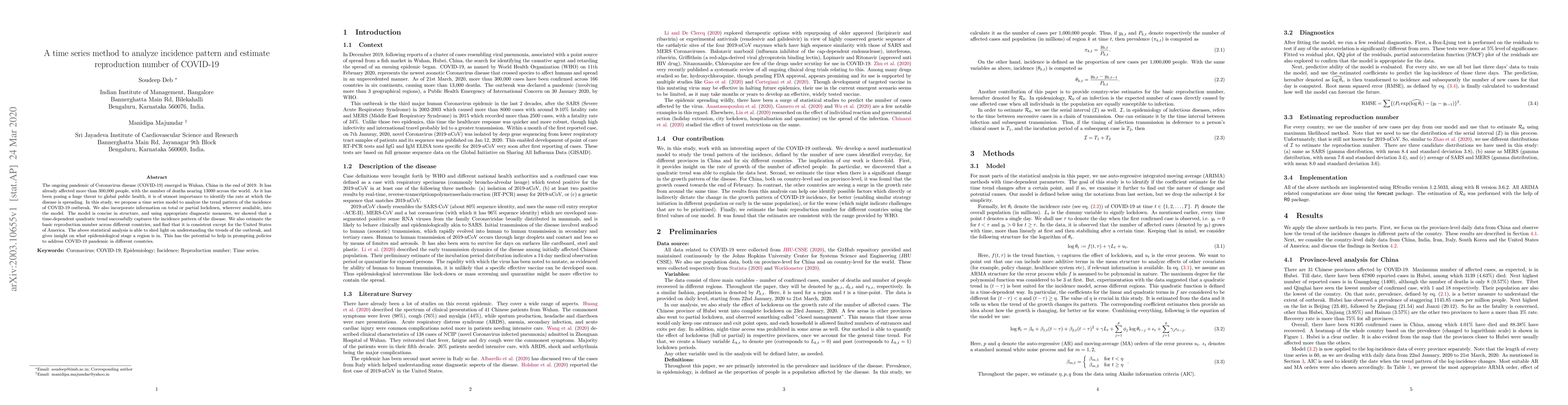 The ongoing pandemic of Coronavirus disease (COVID-19) emerged in Wuhan, China in the end of 2019. It has already affected more than 300,000 people, with the number of deaths nearing 13000 across the world. As it has been posing a huge threat to global public health, it is of utmost importance to identify the rate at which the disease is spreading. In this study, we propose a time series model to analyze the trend pattern of the incidence of COVID-19 outbreak. We also incorporate information on total or partial lockdown, wherever available, into the model. The model is concise in structure, and using appropriate diagnostic measures, we showed that a time-dependent quadratic trend successfully captures the incidence pattern of the disease. We also estimate the basic reproduction number across different countries, and find that it is consistent except for the United States of America. The above statistical analysis is able to shed light on understanding the trends of the outbreak, and gives insight on what epidemiological stage a region is in. This has the potential to help in prompting policies to address COVID-19 pandemic in different countries.