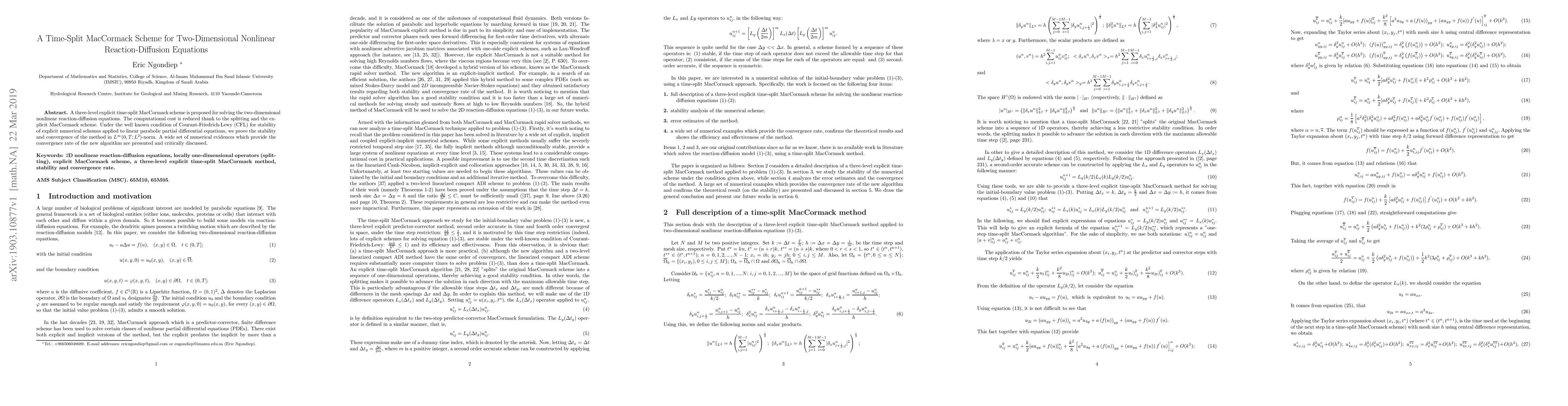This paper proposes a three-level explicit time-split MacCormack scheme to solve two-dimensional nonlinear reaction-diffusion equations, reducing computational cost through splitting. The method is proven stable and convergent under the CFL condition, with numerical evidence supporting its effectiveness.