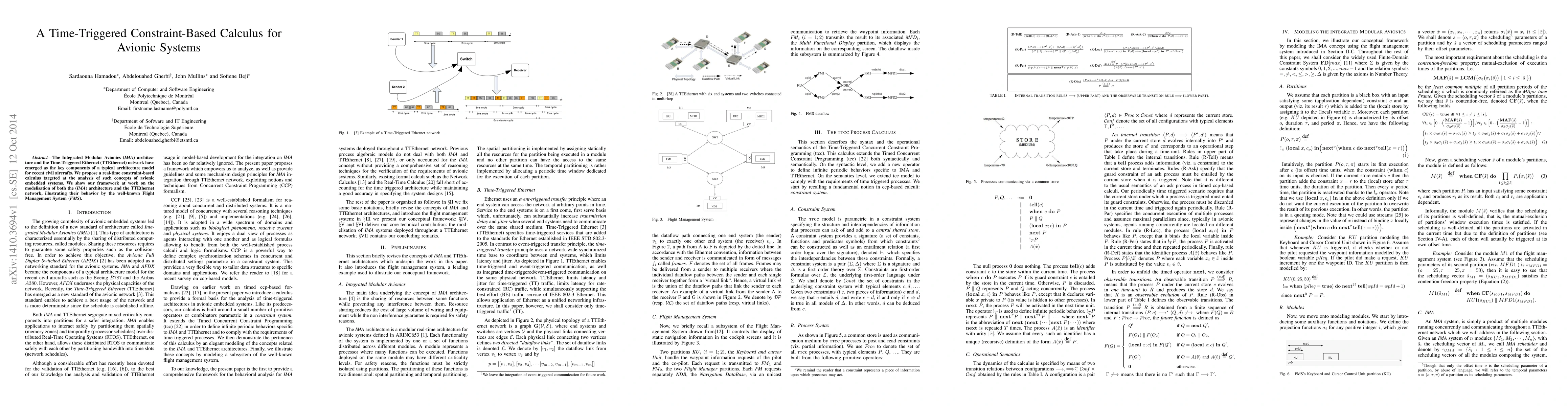 The Integrated Modular Avionics (IMA) architec- ture and the Time-Triggered Ethernet (TTEthernet) network have emerged as the key components of a typical architecture model for recent civil aircrafts. We propose a real-time constraint-based calculus targeted at the analysis of such concepts of avionic embedded systems. We show our framework at work on the modelisation of both the (IMA) architecture and the TTEthernet network, illustrating their behavior by the well-known Flight Management System (FMS).