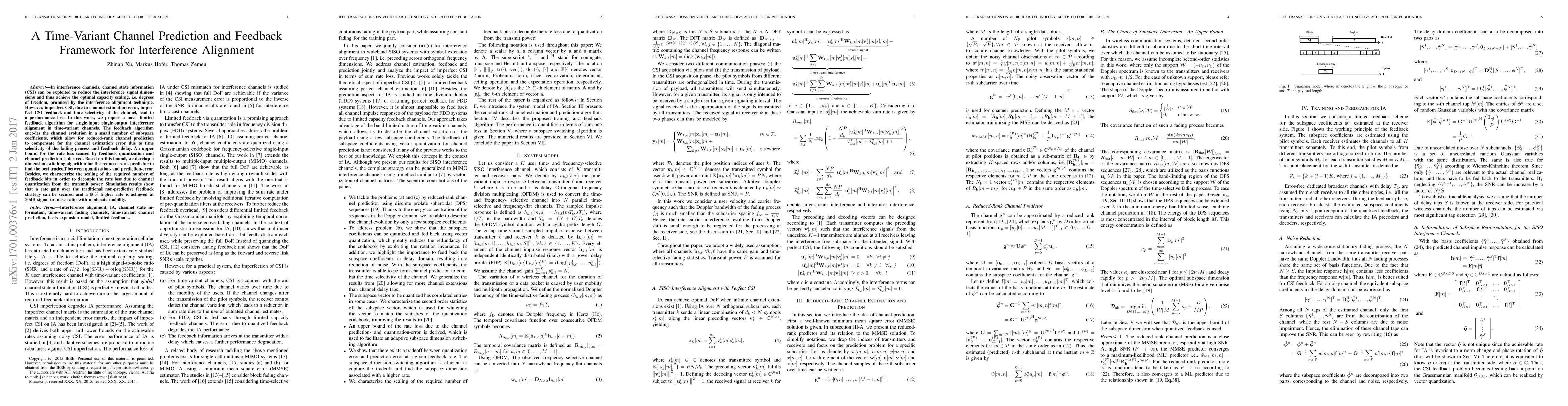 In interference channels, channel state information (CSI) can be exploited to reduce the interference signal dimensions and thus achieve the optimal capacity scaling, i.e. degrees of freedom, promised by the interference alignment technique. However, imperfect CSI, due to channel estimation error, imperfect CSI feedback and time selectivity of the channel, lead to a performance loss. In this work, we propose a novel limited feedback algorithm for single-input single-output interference alignment in time-variant channels. The feedback algorithm encodes the channel evolution in a small number of subspace coefficients, which allow for reduced-rank channel prediction to compensate for the channel estimation error due to time selectivity of the fading process and feedback delay. An upper bound for the rate loss caused by feedback quantization and channel prediction is derived. Based on this bound, we develop a dimension switching algorithm for the reduced-rank predictor to find the best tradeoff between quantization- and prediction-error. Besides, we characterize the scaling of the required number of feedback bits in order to decouple the rate loss due to channel quantization from the transmit power. Simulation results show that a rate gain over the traditional non-predictive feedback strategy can be secured and a 60% higher rate is achieved at 20 dB signal-to-noise ratio with moderate mobility.