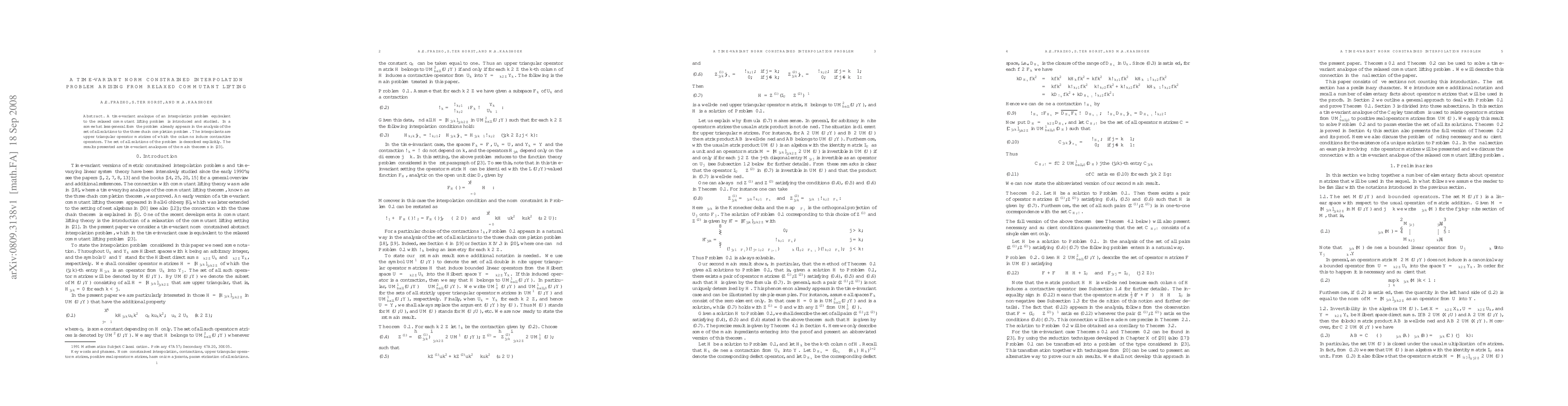 A time-variant analogue of an interpolation problem equivalent to the relaxed commutant lifting problem is introduced and studied. In a somewhat less general form the problem already appears in the analysis of the set of all solutions to the three chain completion problem. The interpolants are upper triangular operator matrices of which the columns induce contractive operators. The set of all solutions of the problem is described explicitly. The results presented are time-variant analogues of the main theorems in [A.E. Frazho, S. ter Horst, and M.A. Kaashoek, All solutions to the relaxed commutant lifting problem, Acta Sci. Math. (Szeged) 72 (2006), 299--318].