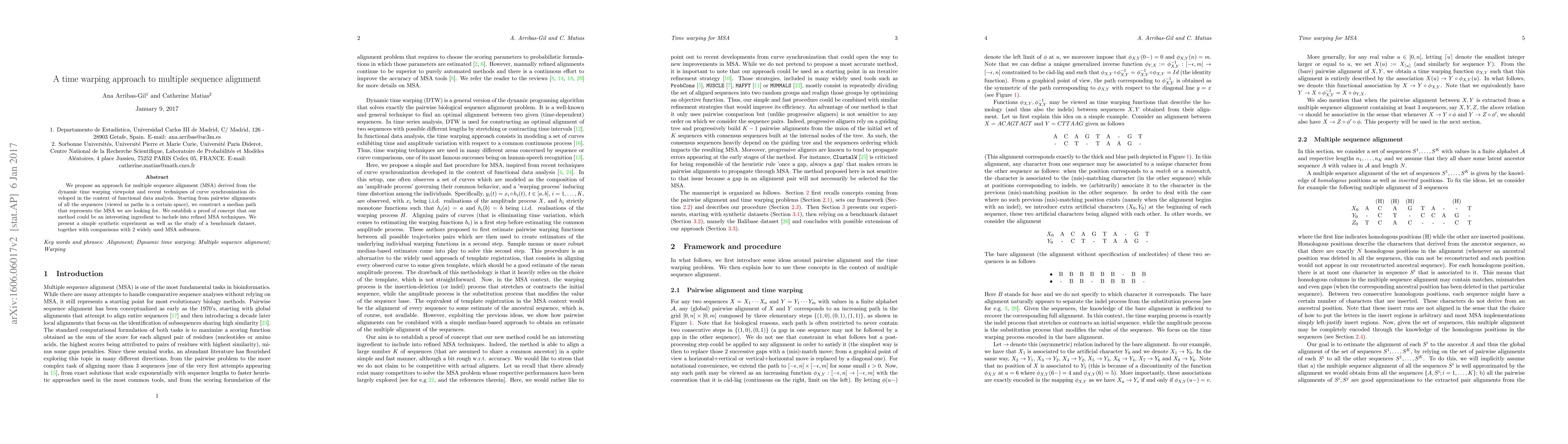 This paper proposes a novel dynamic time warping approach for multiple sequence alignment, leveraging curve synchronization techniques from functional data analysis. The method constructs a median path from pairwise alignments to represent the MSA, demonstrating potential through synthetic experiments and comparisons with established MSA software.