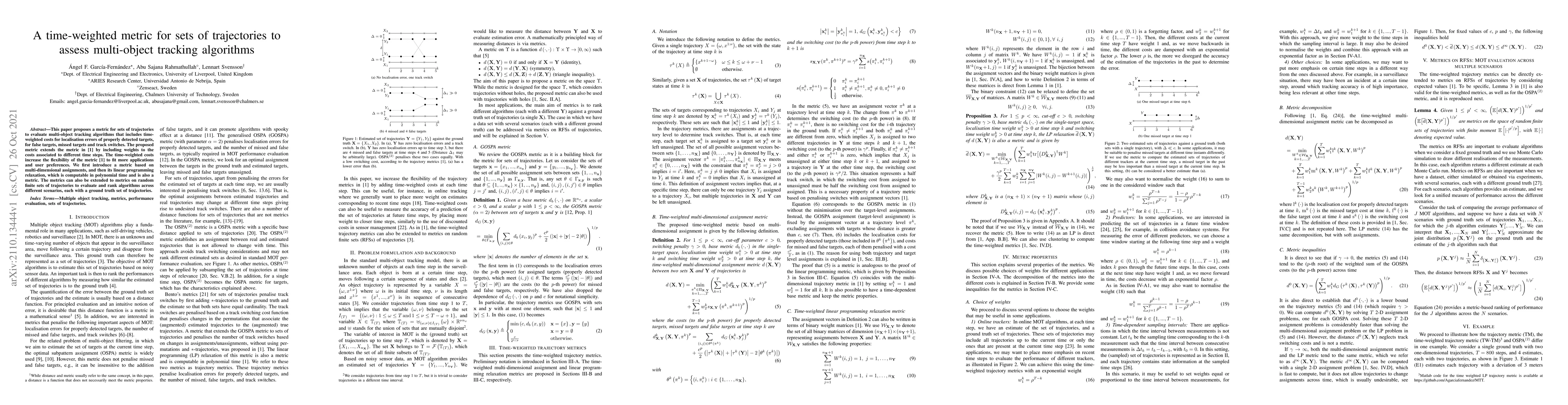 This paper proposes a metric for sets of trajectories to evaluate multi-object tracking algorithms that includes time-weighted costs for localisation errors of properly detected targets, for false targets, missed targets and track switches. The proposed metric extends the metric in [1] by including weights to the costs associated to different time steps. The time-weighted costs increase the flexibility of the metric [1] to fit more applications and user preferences. We first introduce a metric based on multi-dimensional assignments, and then its linear programming relaxation, which is computable in polynomial time and is also a metric. The metrics can also be extended to metrics on random finite sets of trajectories to evaluate and rank algorithms across different scenarios, each with a ground truth set of trajectories.