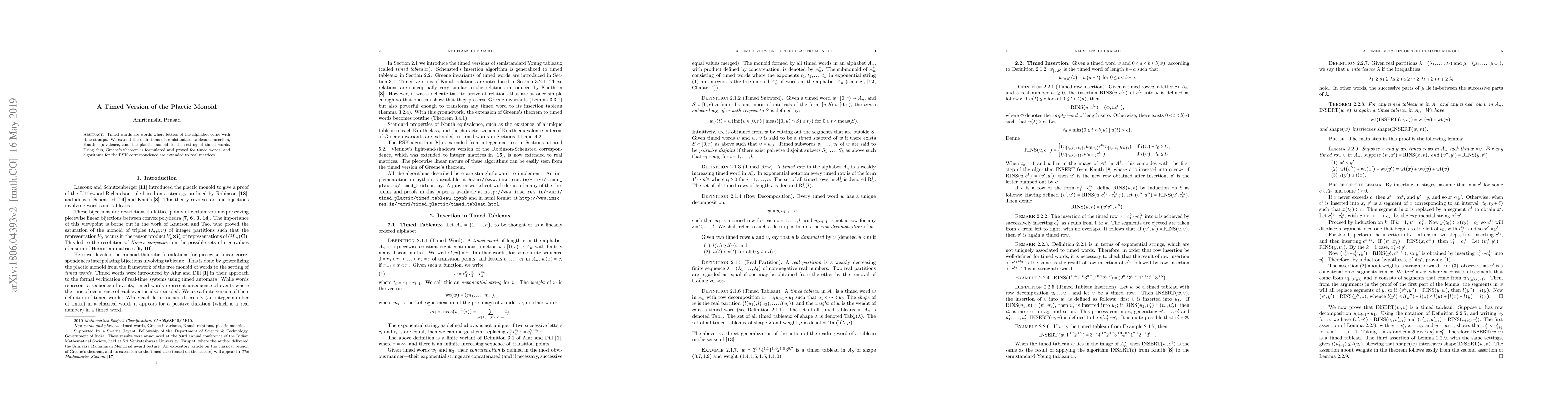 Timed words are words where letters of the alphabet come with time stamps. We extend the definitions of semistandard tableaux, insertion, Knuth equivalence, and the plactic monoid to the setting of timed words. Using this, Greene's theorem is formulated and proved for timed words, and algorithms for the RSK correspondence are extended to real matrices.