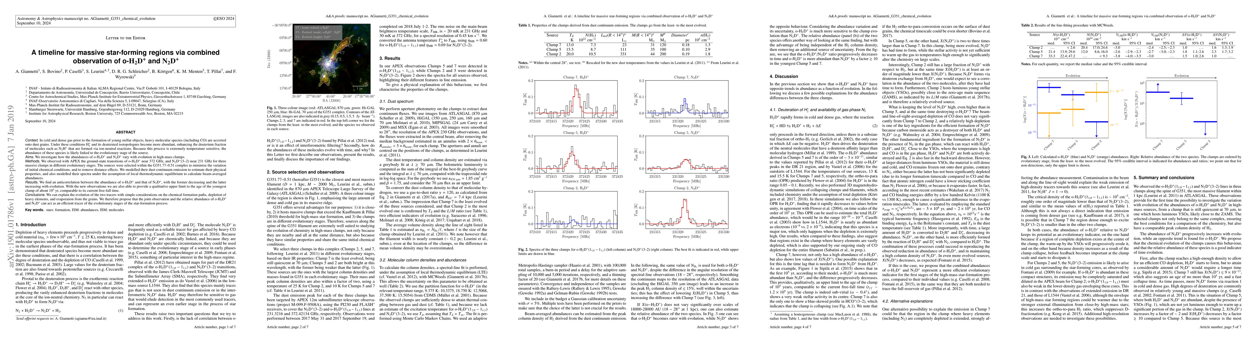 Context: In cold and dense gas prior to the formation of young stellar objects, heavy molecular species (including CO) are accreted onto dust grains. Under these conditions H$_3^+$ and its deuterated isotopologues become more abundant, enhancing the deuterium fraction of molecules such as N$_2$H$^+$ that are formed via ion-neutral reactions. Because this process is extremely temperature sensitive, the abundance of these species is likely linked to the evolutionary stage of the source. Aims: We investigate how the abundances of o-H$_2$D$^+$ and N$_2$D$^+$ vary with evolution in high-mass clumps. Methods: We observed with APEX the ground-state transitions of o-H$_2$D$^+$ near 372 GHz, and N$_2$D$^+$(3-2) near 231 GHz for three massive clumps in different evolutionary stages. The sources were selected within the G351.77-0.51 complex to minimise the variation of initial chemical conditions, and to remove distance effects. We modelled their dust continuum emission to estimate their physical properties, and also modelled their spectra under the assumption of local thermodynamic equilibrium to calculate beam-averaged abundances. Results: We find an anticorrelation between the abundance of o-H$_2$D$^+$ and that of N$_2$D$^+$, with the former decreasing and the latter increasing with evolution. With the new observations we are also able to provide a qualitative upper limit to the age of the youngest clump of about 10$^5$ yr, comparable to its current free-fall time. Conclusions: We can explain the evolution of the two tracers with simple considerations on the chemical formation paths, depletion of heavy elements, and evaporation from the grains. We therefore propose that the joint observation and the relative abundance of o-H$_2$D$^+$ and N$_2$D$^+$ can act as an efficient tracer of the evolutionary stages of the star-formation process.