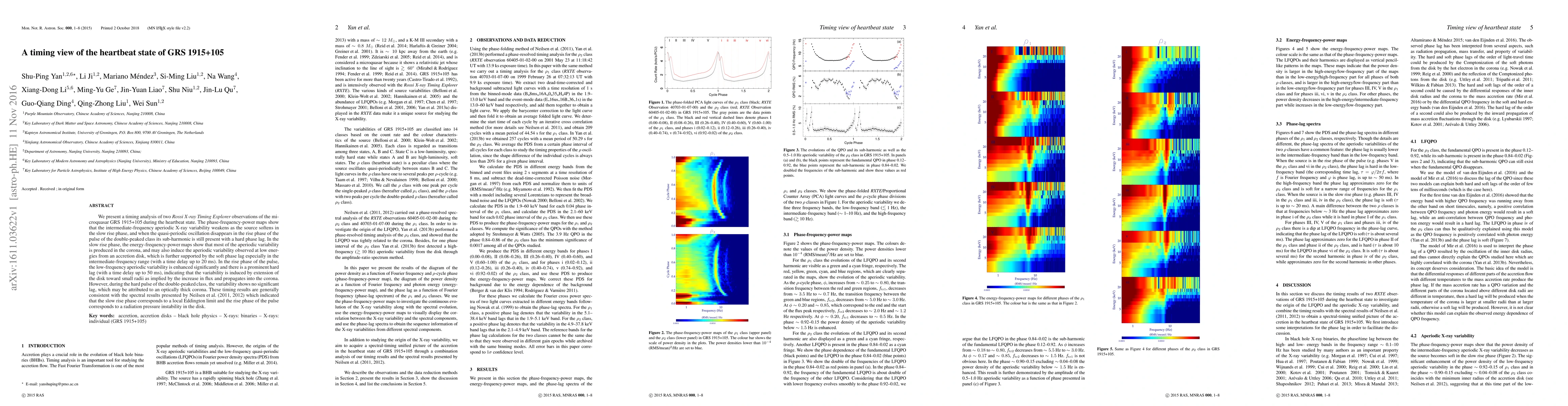We present a timing analysis of two Rossi X-ray Timing Explorer observations of the microquasar GRS 1915+105 during the heartbeat state. The phase-frequency-power maps show that the intermediate-frequency aperiodic X-ray variability weakens as the source softens in the slow rise phase, and when the quasi-periodic oscillation disappears in the rise phase of the pulse of the double-peaked class its sub-harmonic is still present with a hard phase lag. In the slow rise phase, the energy-frequency-power maps show that most of the aperiodic variability is produced in the corona, and may also induce the aperiodic variability observed at low energies from an accretion disk, which is further supported by the soft phase lag especially in the intermediate-frequency range (with a time delay up to 20 ms). In the rise phase of the pulse, the low-frequency aperiodic variability is enhanced significantly and there is a prominent hard lag (with a time delay up to 50 ms), indicating that the variability is induced by extension of the disk toward small radii as implied by the increase in flux and propagates into the corona. However, during the hard pulse of the double-peaked class, the variability shows no significant lag, which may be attributed to an optically thick corona. These timing results are generally consistent with the spectral results presented by Neilsen et al. (2011, 2012) which indicated that the slow rise phase corresponds to a local Eddington limit and the rise phase of the pulse corresponds to a radiation pressure instability in the disk.