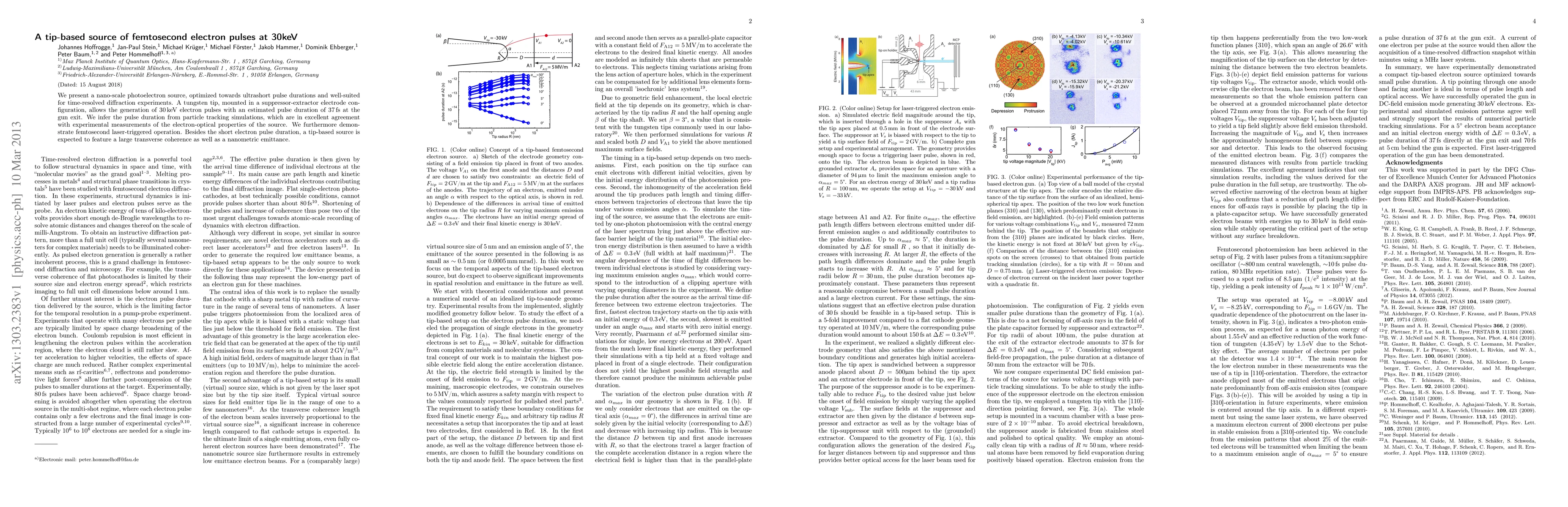 Researchers developed a nano-scale photoelectron source that produces 30 keV electron pulses with a duration of 37 fs, suitable for time-resolved diffraction experiments.