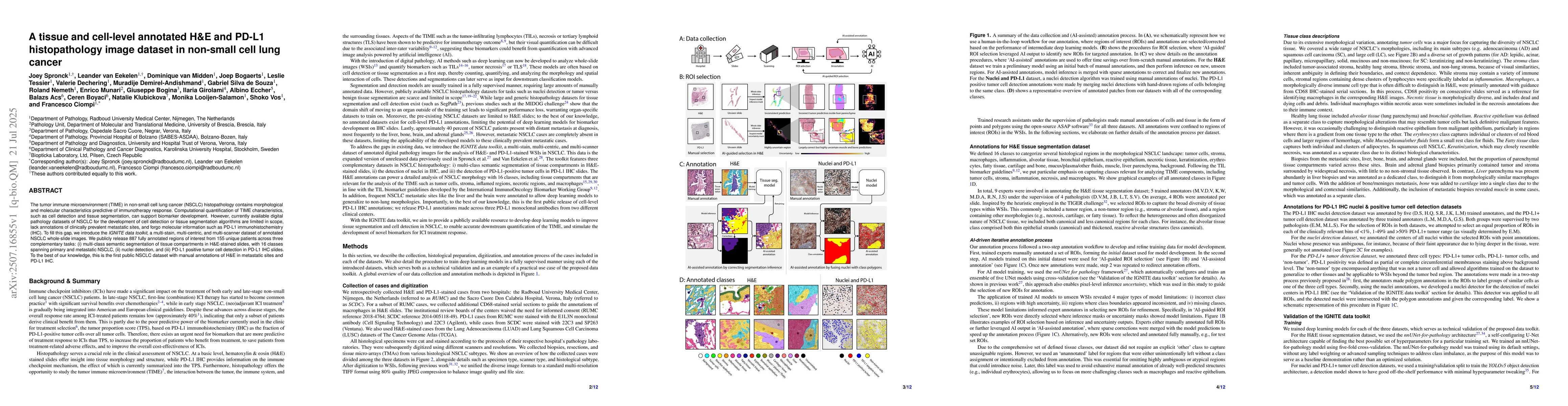The tumor immune microenvironment (TIME) in non-small cell lung cancer (NSCLC) histopathology contains morphological and molecular characteristics predictive of immunotherapy response. Computational quantification of TIME characteristics, such as cell detection and tissue segmentation, can support biomarker development. However, currently available digital pathology datasets of NSCLC for the development of cell detection or tissue segmentation algorithms are limited in scope, lack annotations of clinically prevalent metastatic sites, and forgo molecular information such as PD-L1 immunohistochemistry (IHC). To fill this gap, we introduce the IGNITE data toolkit, a multi-stain, multi-centric, and multi-scanner dataset of annotated NSCLC whole-slide images. We publicly release 887 fully annotated regions of interest from 155 unique patients across three complementary tasks: (i) multi-class semantic segmentation of tissue compartments in H&E-stained slides, with 16 classes spanning primary and metastatic NSCLC, (ii) nuclei detection, and (iii) PD-L1 positive tumor cell detection in PD-L1 IHC slides. To the best of our knowledge, this is the first public NSCLC dataset with manual annotations of H&E in metastatic sites and PD-L1 IHC.