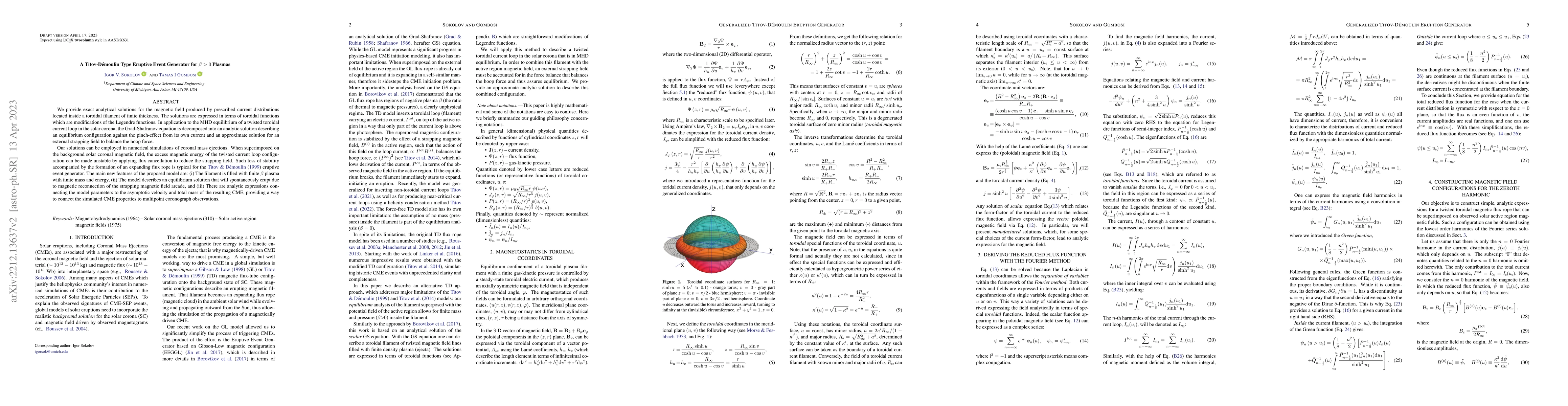 This paper presents exact analytical solutions for magnetic fields in $\beta>0$ plasmas, applicable to twisted toroidal current loops in the solar corona. The model describes an equilibrium configuration that can erupt due to magnetic reconnection, offering a new Titov-D\'emoulin type eruptive event generator with analytic expressions linking model parameters to CME properties.