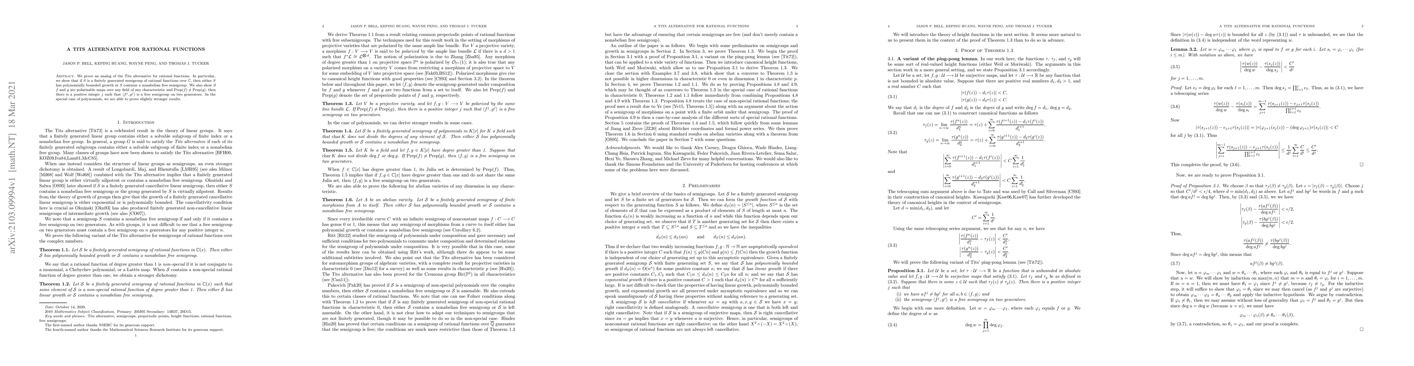 The paper proves a Tits alternative for rational functions, showing that finitely generated semigroups either have polynomially bounded growth or contain nonabelian free semigroups.