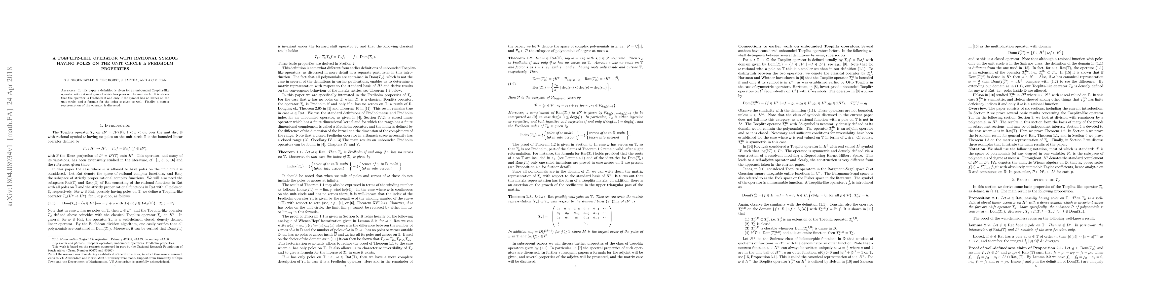 This paper defines an unbounded Toeplitz-like operator with rational symbol having poles on the unit circle, proving it is Fredholm if the symbol has no zeroes on the unit circle, and provides a formula for its index along with a matrix representation.