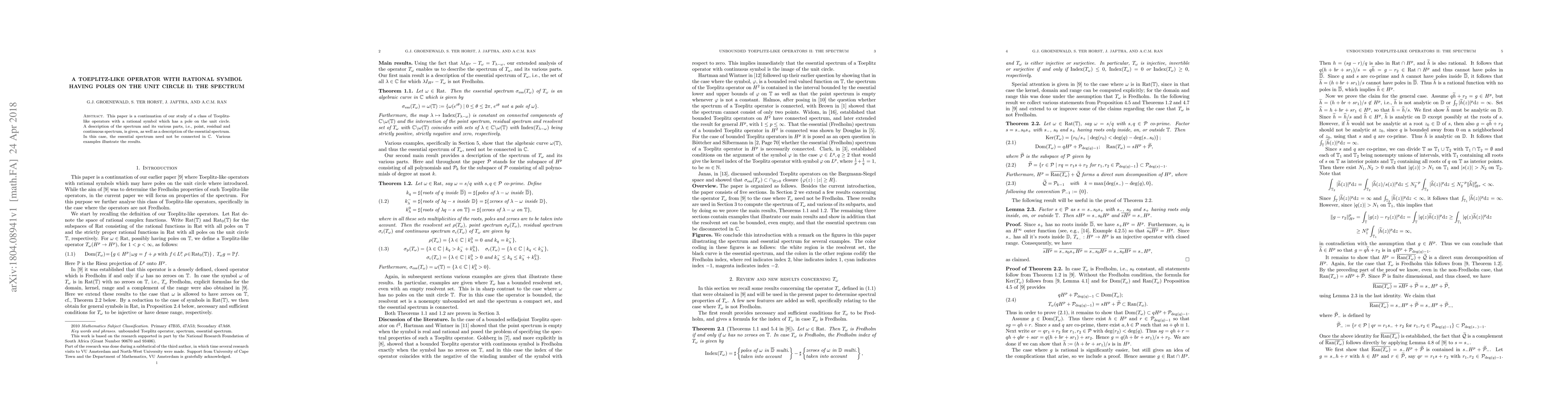 This paper is a continuation of our study of a class of Toeplitz-like operators with a rational symbol which has a pole on the unit circle. A description of the spectrum and its various parts, i.e., point, residual and continuous spectrum, is given, as well as a description of the essential spectrum. In this case, the essential spectrum need not be connected in ${\mathbb C}$. Various examples illustrate the results.