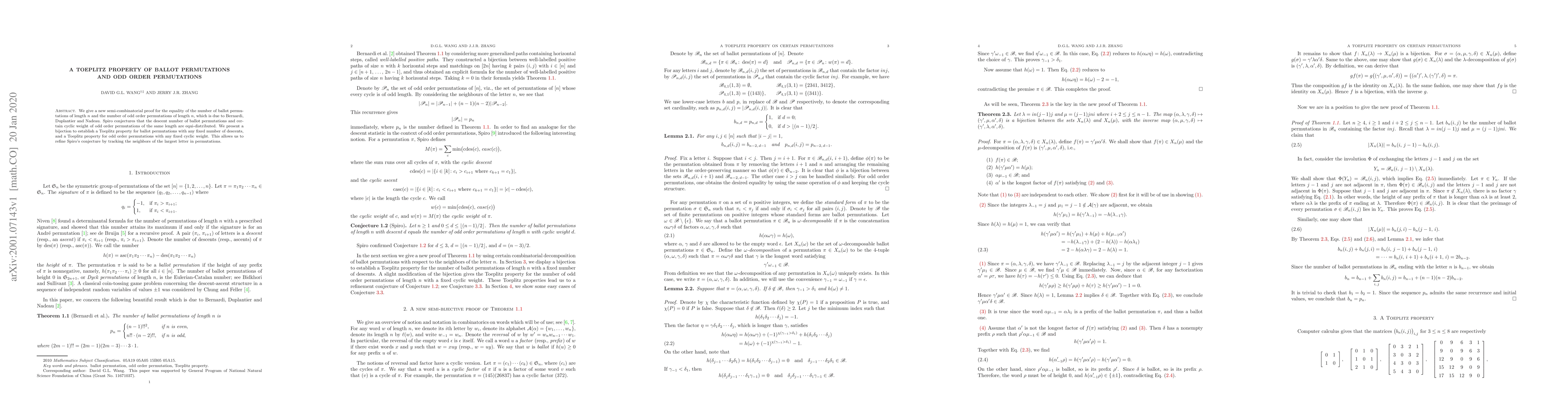 This paper provides a new semi-combinatorial proof for the equality between ballot permutations and odd order permutations of the same length, establishing a Toeplitz property for both types of permutations with fixed characteristics. It also refines Spiro's conjecture by linking the descent number of ballot permutations to the cyclic weight of odd order permutations.
