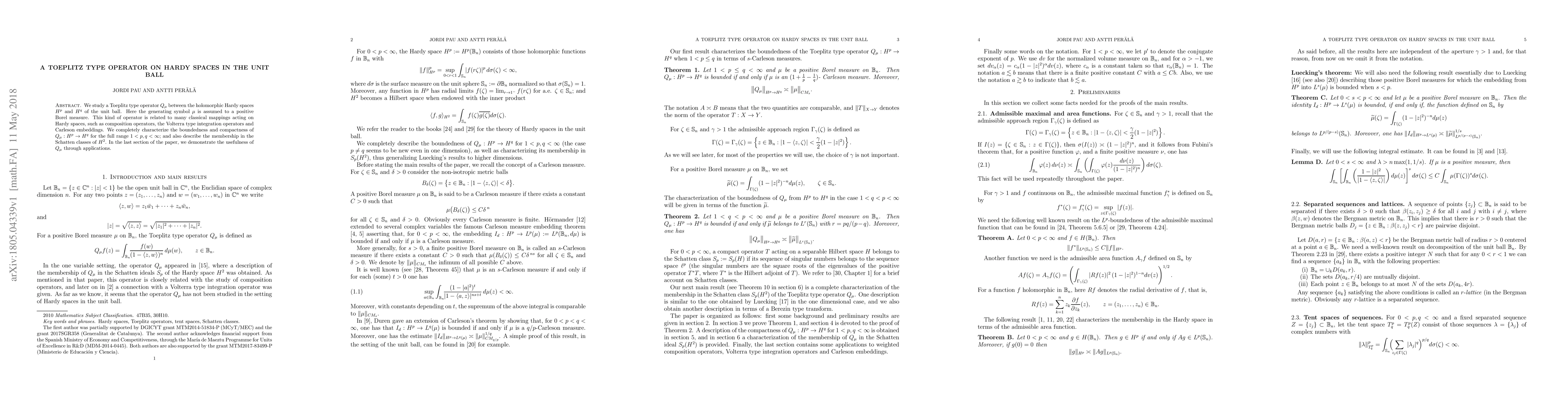 This paper characterizes the boundedness, compactness, and Schatten class membership of a Toeplitz type operator $Q_\mu$ on holomorphic Hardy spaces $H^p$ and $H^q$ within the unit ball, using a generating symbol $\mu$ that is a positive Borel measure. Applications of the operator are also discussed.