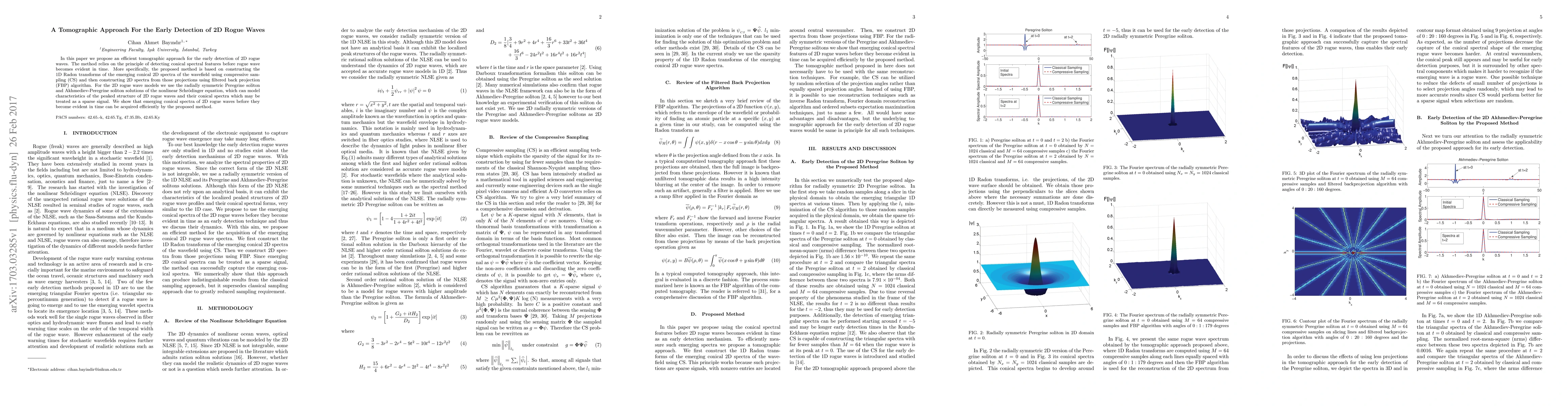 This paper proposes a tomographic method for early detection of 2D rogue waves by detecting conical spectral features in 1D Radon transforms using compressive sampling, followed by 2D spectrum reconstruction via filtered back projection. The method is demonstrated using Peregrine and Akhmediev-Peregrine soliton solutions, showing effective acquisition of conical spectra before rogue waves become evident.