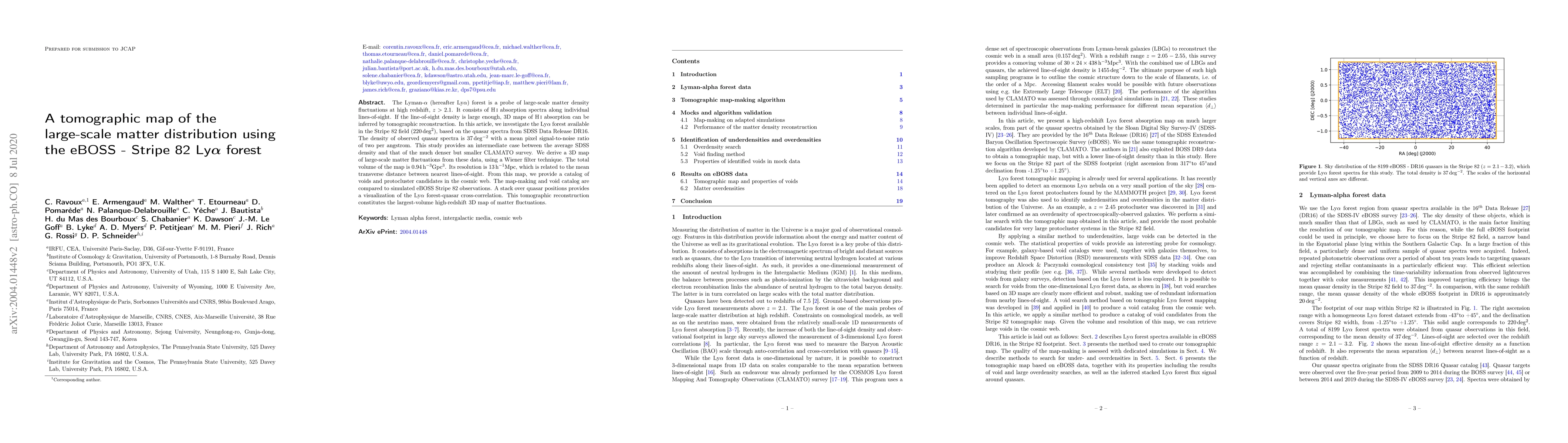 The Lyman-$\alpha$ (hereafter Ly-$\alpha$) forest is a probe of large-scale matter density fluctuations at high redshift, $z > 2.1$. It consists of HI absorption spectra along individual lines-of-sight. If the line-of-sight density is large enough, 3D maps of HI absorption can be inferred by tomographic reconstruction. In this article, we investigate the Ly-$\alpha$ forest available in the Stripe 82 field ($220\,\mathrm{deg^{2}}$), based on the quasar spectra from SDSS Data Release DR16. The density of observed quasar spectra is $37\,\mathrm{deg^{-2}}$ with a mean pixel signal-to-noise ratio of two per angstrom. This study provides an intermediate case between the average SDSS density and that of the much denser but smaller CLAMATO survey. We derive a 3D map of large-scale matter fluctuations from these data, using a Wiener filter technique. The total volume of the map is $0.94\,\mathrm{h^{-3} Gpc^{3}}$. Its resolution is $13\,\mathrm{h^{-1} Mpc}$, which is related to the mean transverse distance between nearest lines-of-sight. From this map, we provide a catalog of voids and protocluster candidates in the cosmic web. The map-making and void catalog are compared to simulated eBOSS Stripe 82 observations. A stack over quasar positions provides a visualization of the Ly-$\alpha$ quasar cross-correlation. This tomographic reconstruction constitutes the largest-volume high-redshift 3D map of matter fluctuations.