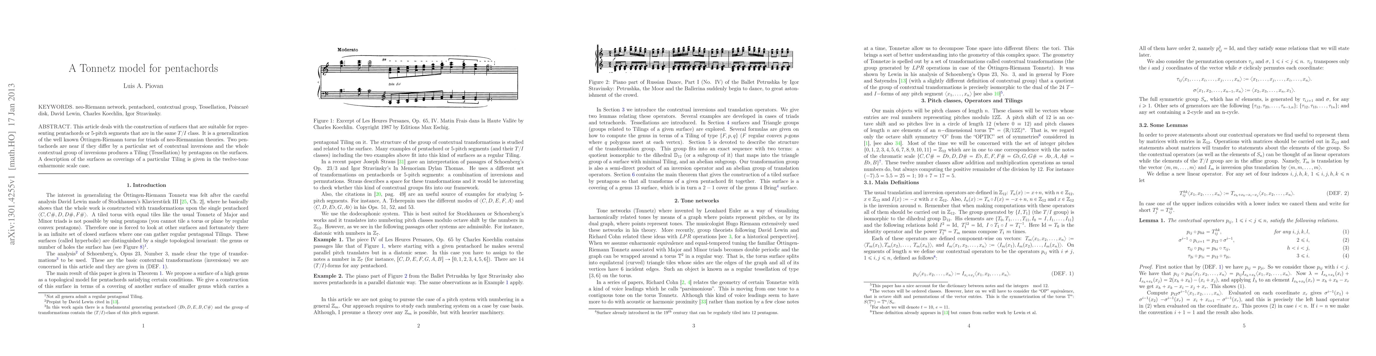 This research develops a geometric model using surfaces tiled with pentagons to represent five-note musical segments (pentachords) that share certain transformational properties. It extends previous models for triads, offering new insights into the structure and relationships of complex chords in twelve-tone music.
