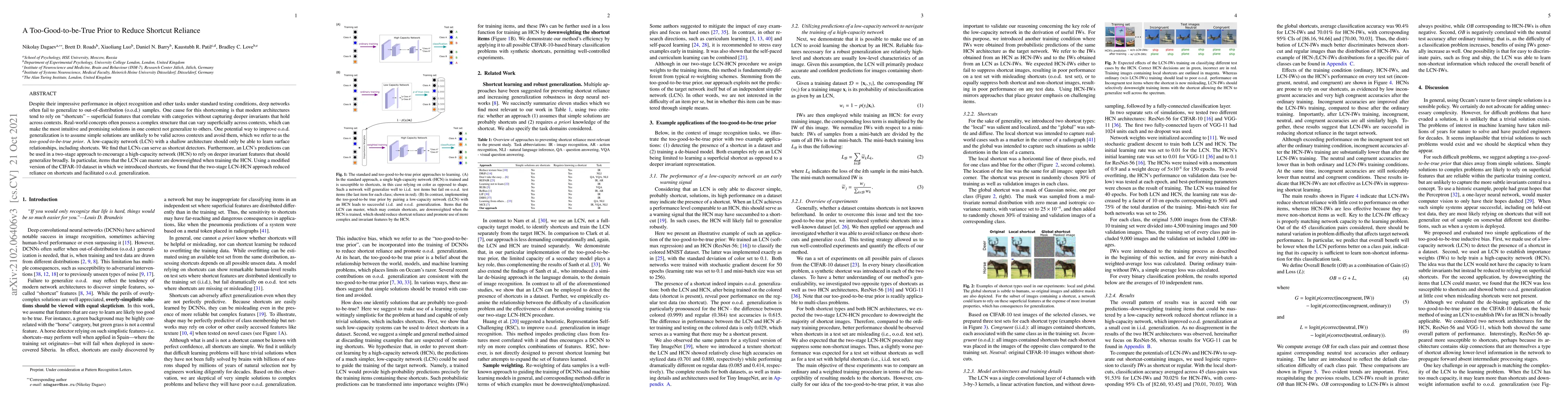 This paper explores how a low-capacity network (LCN) can identify and mitigate shortcut reliance in high-capacity networks (HCNs), thereby improving generalization to out-of-distribution samples. The "too-good-to-be-true" prior suggests that simple solutions are less likely to generalize, and using LCNs to detect shortcuts, a two-stage training approach encourages HCNs to focus on deeper, more generalizable features.