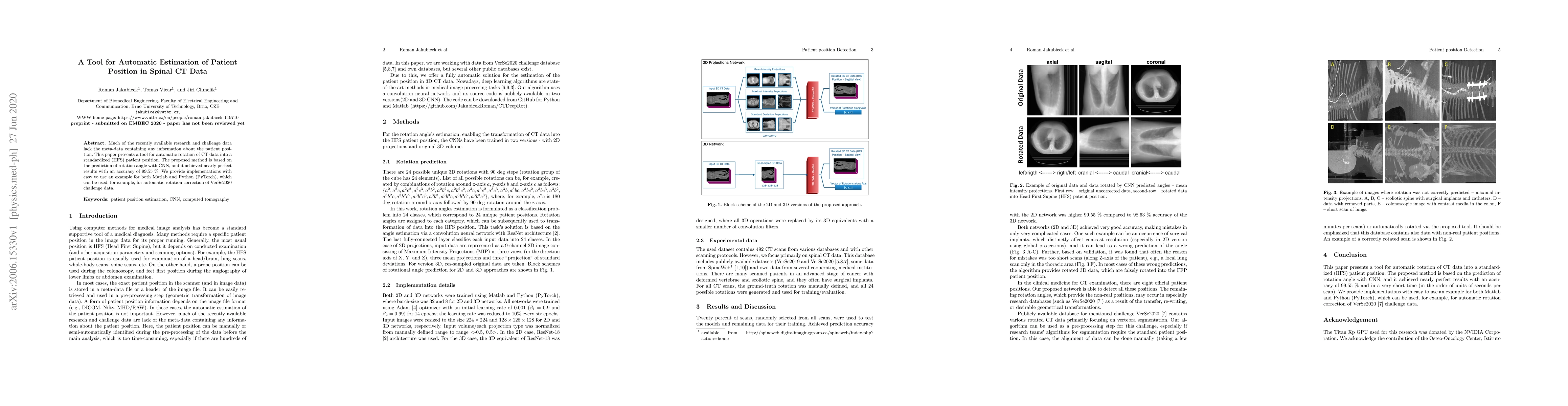This paper introduces a tool for automatically estimating and correcting patient position in spinal CT data using a CNN-based method to predict the rotation angle, achieving 99.55% accuracy. It provides implementations in both Matlab and Python (PyTorch) for practical use.