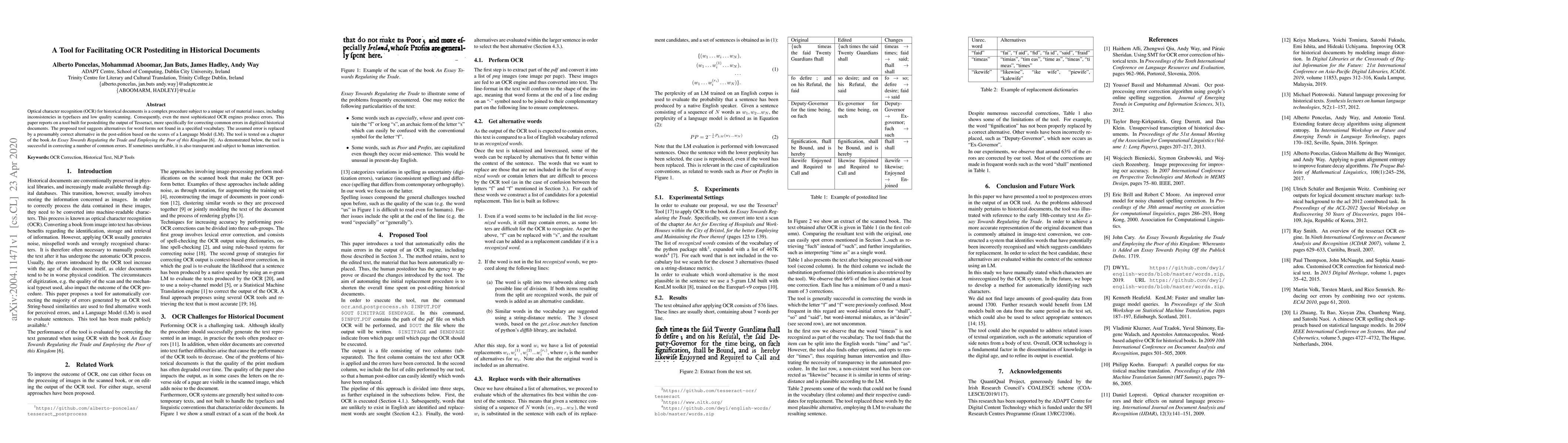 This paper introduces a tool designed to assist in postediting OCR output for historical documents, focusing on correcting common errors using a Language Model (LM) to suggest correct word alternatives. The tool was tested on a chapter from Cary's 1719 book, demonstrating its effectiveness in error correction while allowing for human intervention.