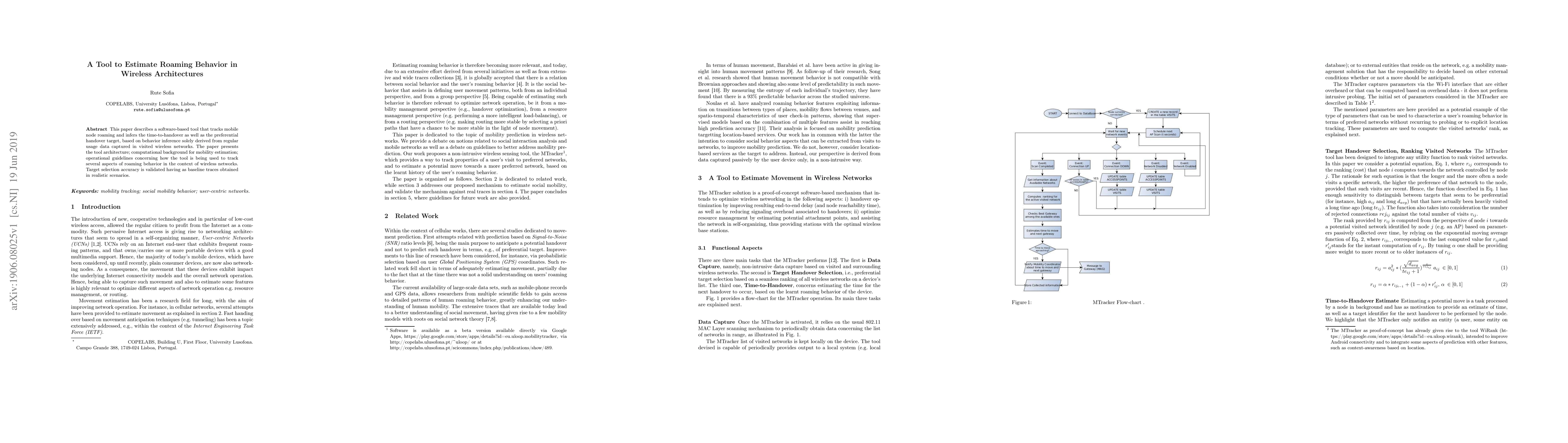 This paper describes a software-based tool that tracks mobile node roaming and infers the time-to-handover as well as the preferential handover target, based on behavior inference solely derived from regular usage data captured in visited wireless networks. The paper presents the tool architecture; computational background for mobility estimation; operational guidelines concerning how the tool is being used to track several aspects of roaming behavior in the context of wireless networks. Target selection accuracy is validated having as baseline traces obtained in realistic scenarios.