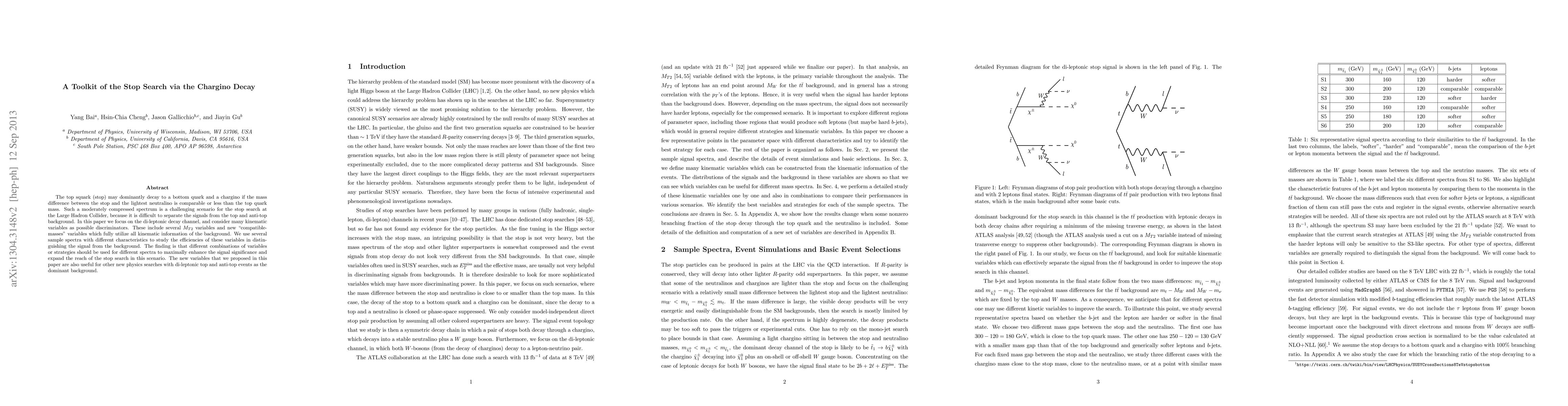 The top squark (stop) may dominantly decay to a bottom quark and a chargino if the mass difference between the stop and the lightest neutralino is comparable or less than the top quark mass. Such a moderately compressed spectrum is a challenging scenario for the stop search at the Large Hadron Collider, because it is difficult to separate the signals from the top and anti-top background. In this paper we focus on the di-leptonic decay channel, and consider many kinematic variables as possible discriminators. These include several MT2 variables and new "compatible-masses" variables which fully utilize all kinematic information of the background. We use several sample spectra with different characteristics to study the efficiencies of these variables in distinguishing the signal from the background. The finding is that different combinations of variables or strategies should be used for different spectra to maximally enhance the signal significance and expand the reach of the stop search in this scenario. The new variables that we proposed in this paper are also useful for other new physics searches with di-leptonic top and anti-top events as the dominant background.