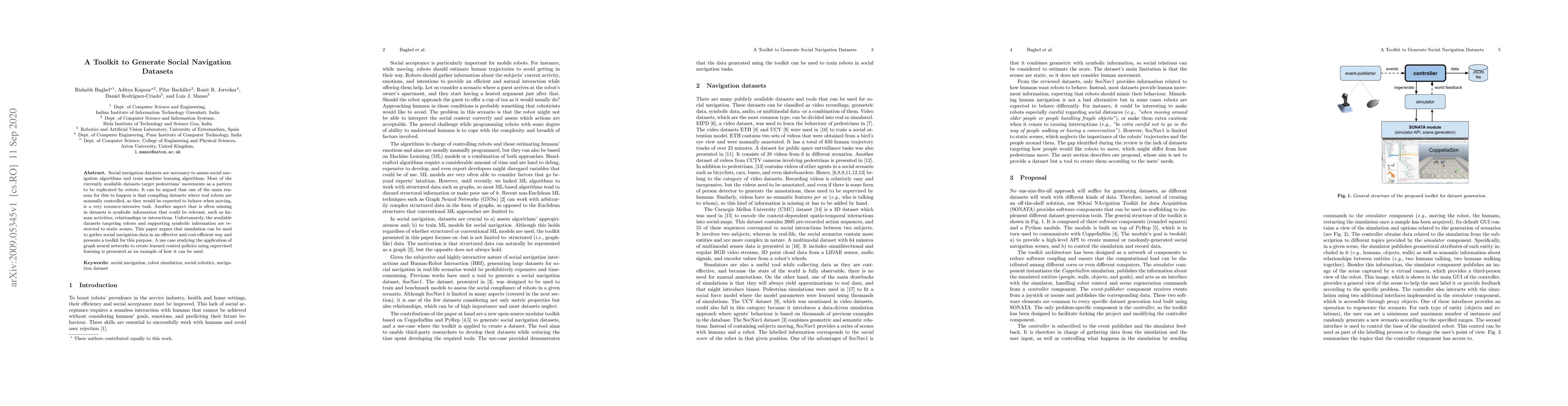 A toolkit for generating social navigation datasets using simulation is proposed to address limitations of existing datasets. This approach offers a cost-efficient way to gather symbolic information such as human activities and interactions.
