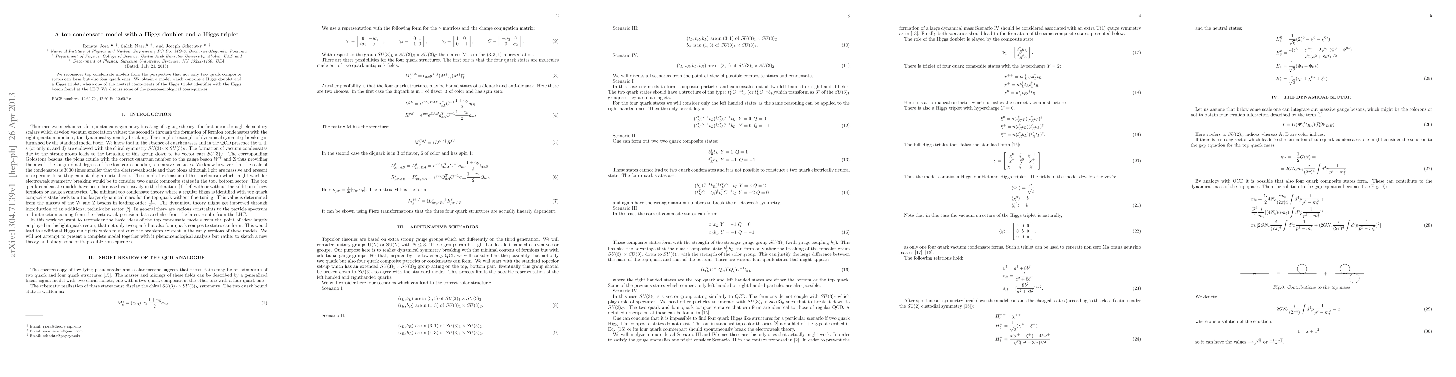 We reconsider top condensate models from the perspective that not only two quark composite fields can form but also four quark ones. We obtain a model which contains a Higgs doublet and a Higgs triplet, where one of the neutral components of the Higgs triplet identifies with the Higgs boson found at the LHC. We discuss some of the phenomenological consequences.