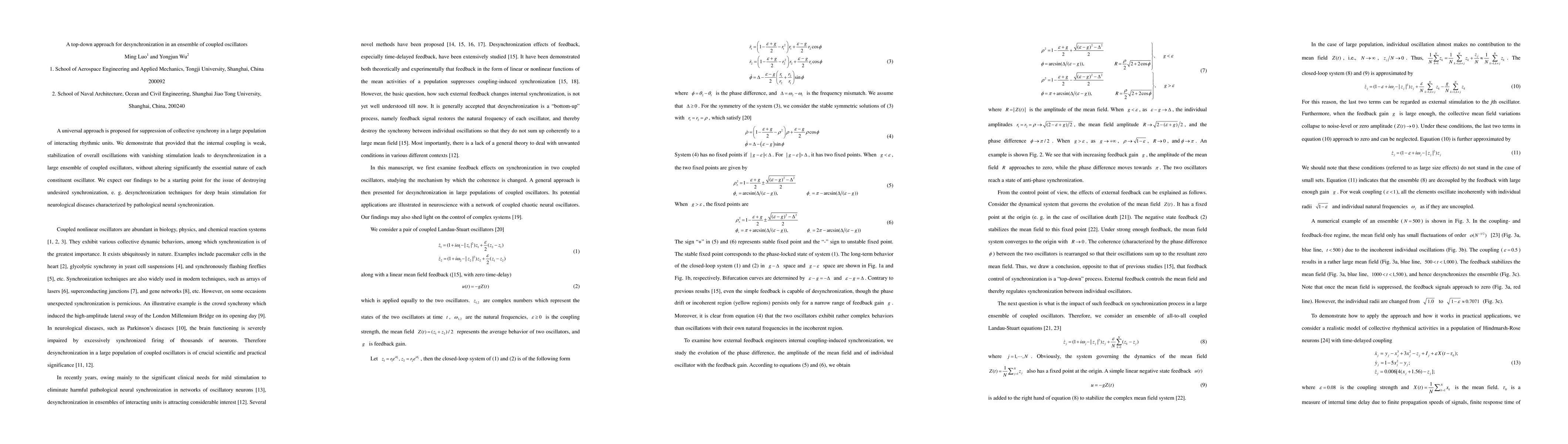 This paper proposes a method to desynchronize an ensemble of coupled oscillators by stabilizing their oscillations without external stimulation, which can be applied to disrupt pathological neural synchronization in neurological diseases. The approach maintains the intrinsic properties of individual oscillators.