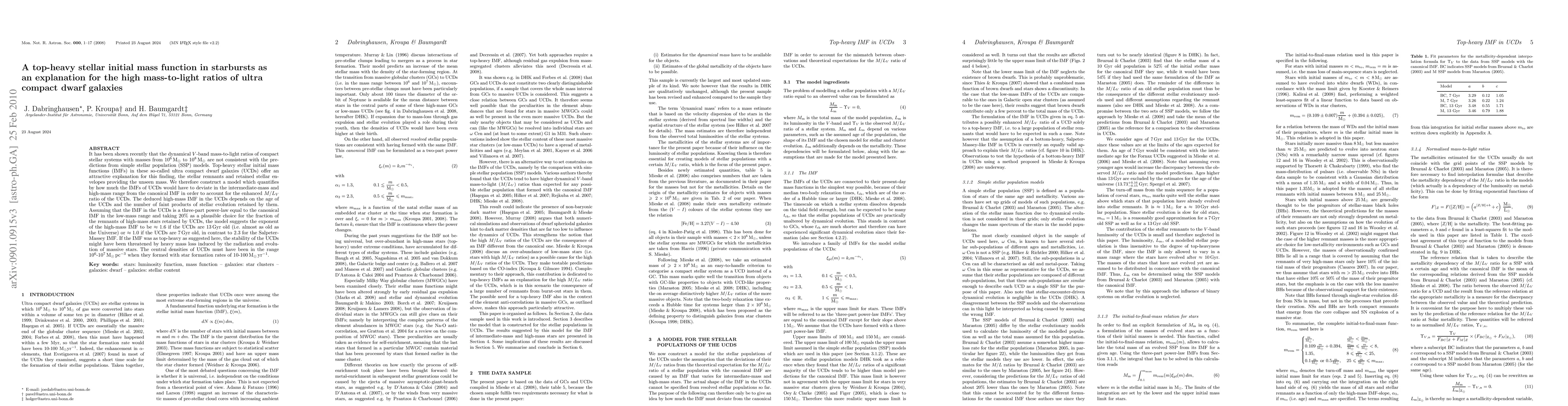 This paper proposes that a top-heavy stellar initial mass function (IMF) in ultra compact dwarf galaxies (UCDs) explains their high mass-to-light ratios, attributing the unseen mass to stellar remnants and retained envelopes. The model suggests the high-mass IMF exponent is around 1.6 for 13 Gyr old UCDs and 1.0 for 7 Gyr old UCDs, contrasting with the canonical Salpeter-Massey IMF.
