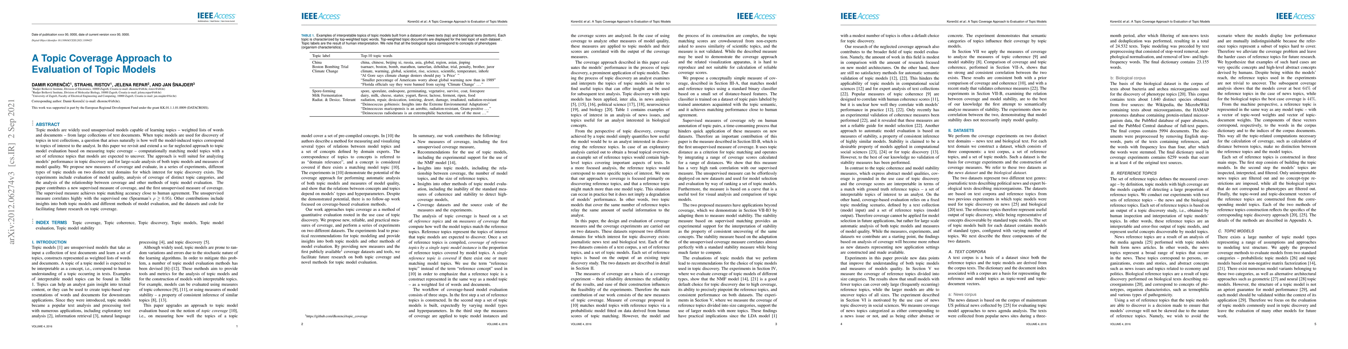 This paper proposes new measures for evaluating topic models based on topic coverage, comparing model-generated topics against reference topics. It introduces both supervised and unsupervised coverage measures, demonstrating their effectiveness through experiments on different text domains.