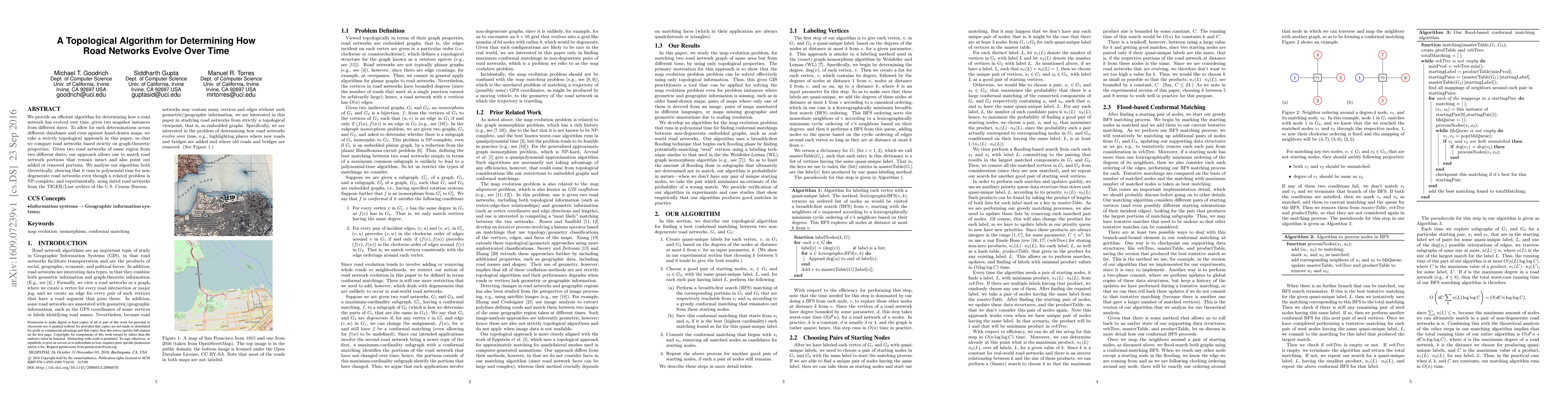 This paper presents a topological algorithm to compare road networks from different dates based on graph-theoretic properties, enabling the identification of unchanged, added, or removed portions. The algorithm runs in polynomial time and is validated both theoretically and experimentally using U.S. Census Bureau road data.