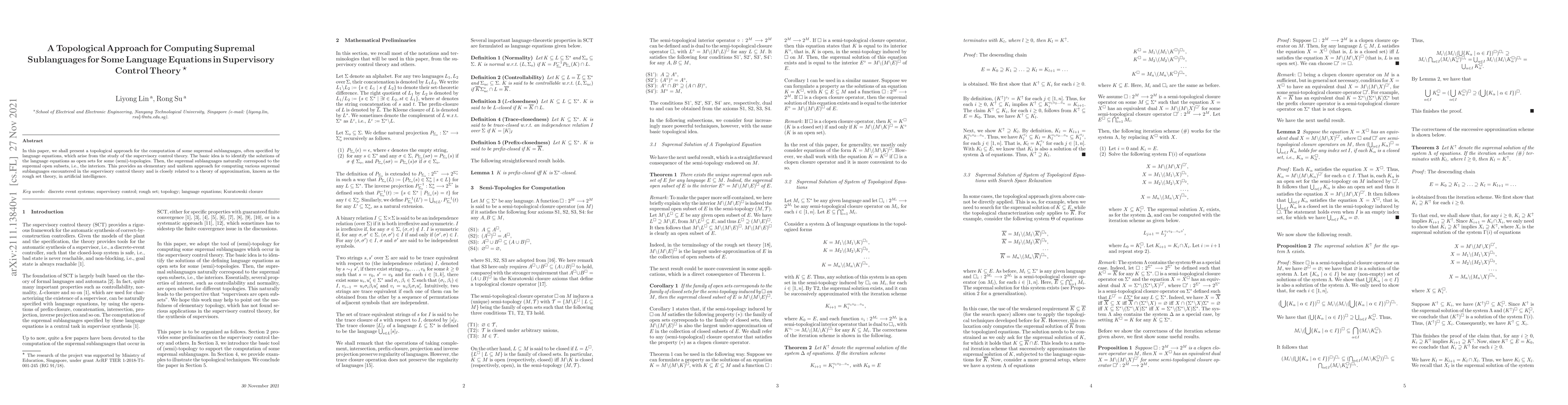In this paper, we shall present a topological approach for the computation of some supremal sublanguages, often specified by language equations, which arise from the study of the supervisory control theory. The basic idea is to identify the solutions of the language equations as open sets for some (semi)-topologies. Then, the supremal sublanguages naturally correspond to the supremal open subsets, i.e., the interiors. This provides an elementary and uniform approach for computing various supremal sublanguages encountered in the supervisory control theory and is closely related to a theory of approximation, known as the rough set theory, in artificial intelligence.