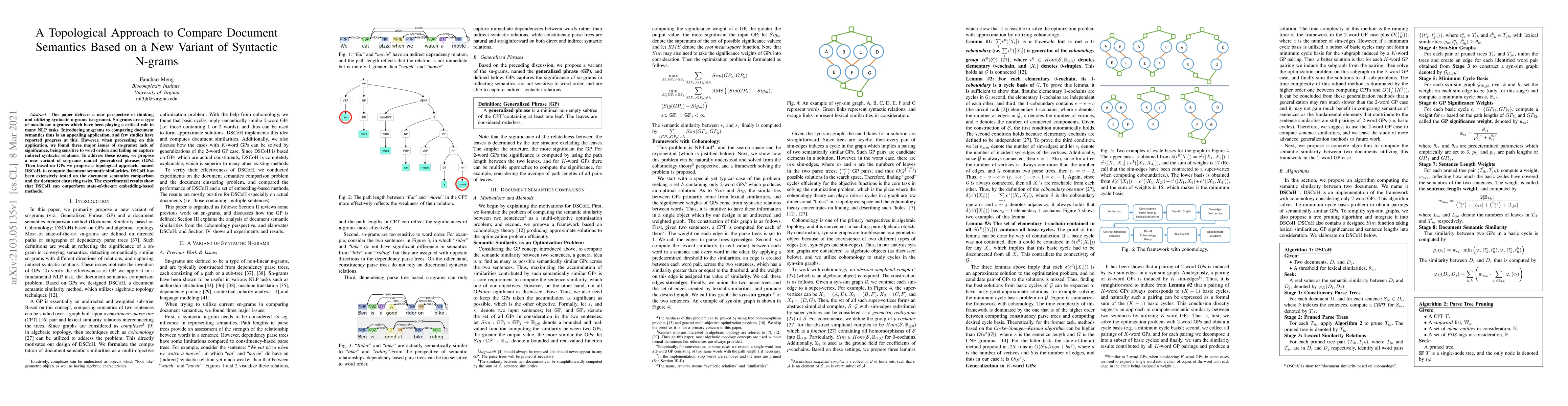 This paper introduces a new variant of syntactic n-grams called generalized phrases (GPs) to address issues with traditional sn-grams. It proposes a topological approach, DSCoH, for comparing document semantics, which outperforms existing embedding-based methods in experiments.