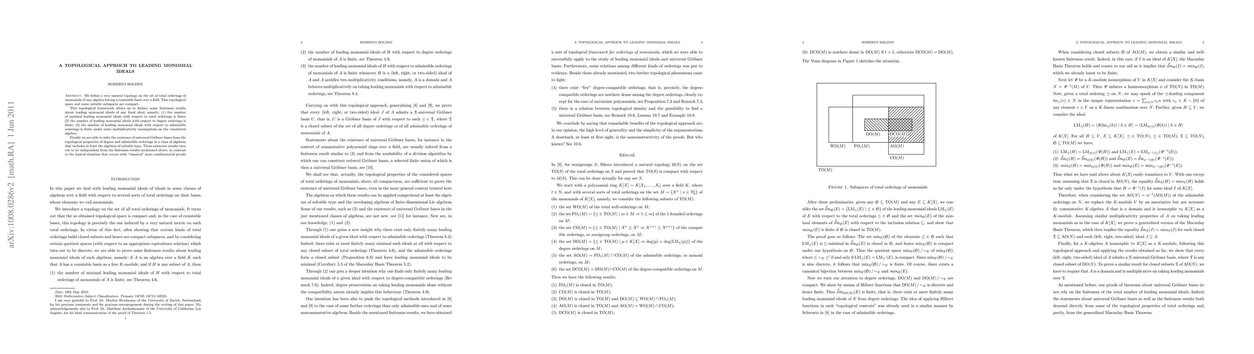 We introduce a very natural topology on the set of total orderings of monomials of any algebra having a countable basis over a field. This topological space and some notable subspaces are compact. This topological framework allows us to deduce some finiteness results about leading monomial ideals of any fixed ideal, namely: (1) the number of minimal leading monomial ideals with respect to total orderings is finite; (2) the number of leading monomial ideals with respect to degree orderings is finite; (3) the number of leading monomial ideals with respect to admissible orderings is finite under some multiplicativity assumptions on the considered algebra. Finally we are able to infer the existence of universal Groebner bases from the topological properties of degree and admissible orderings in a class of algebras that includes at least the algebras of solvable type. These existence results turn out to be independent from the finiteness results mentioned above, in contrast to the typical situation that occurs with "classical" more combinatorial proofs.