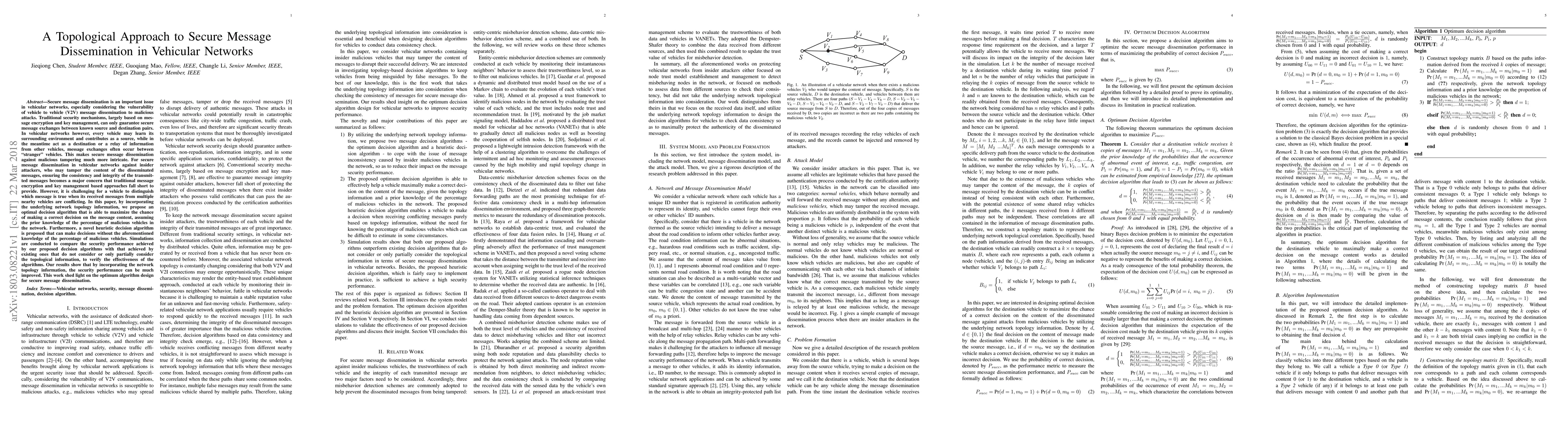 The research proposes two decision algorithms for secure message dissemination in vehicular networks, utilizing network topology information. The algorithms aim to ensure message consistency and integrity against malicious attacks, particularly insider attackers tampering with message content.
