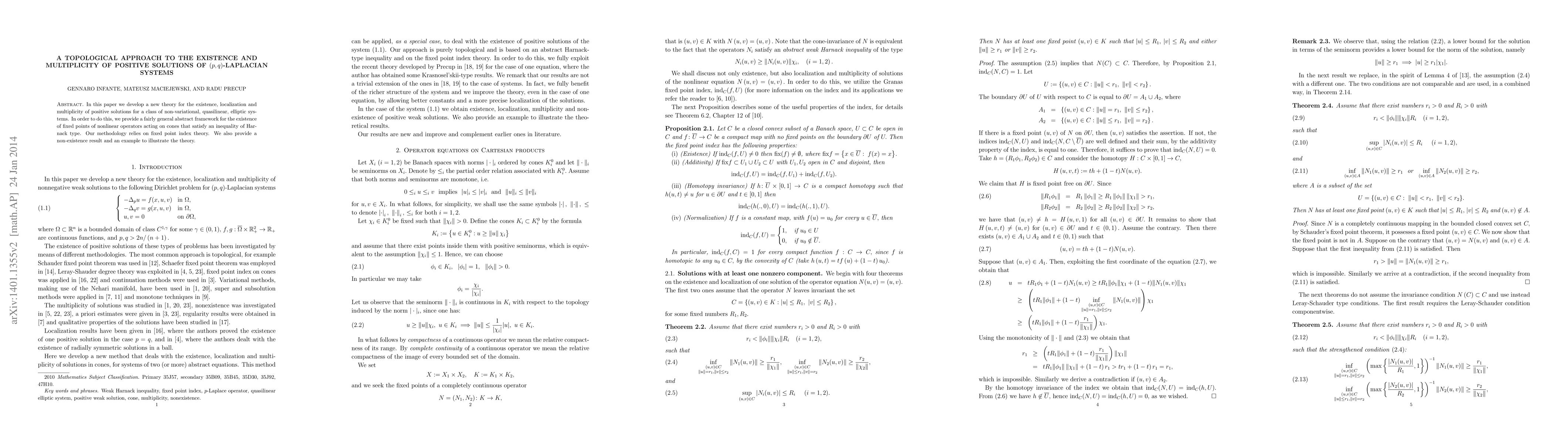 This paper develops a new topological framework for proving the existence and multiplicity of positive solutions for quasilinear, elliptic $(p,q)$-Laplacian systems, utilizing fixed point index theory and Harnack-type inequalities. It also includes a non-existence result and an illustrative example.