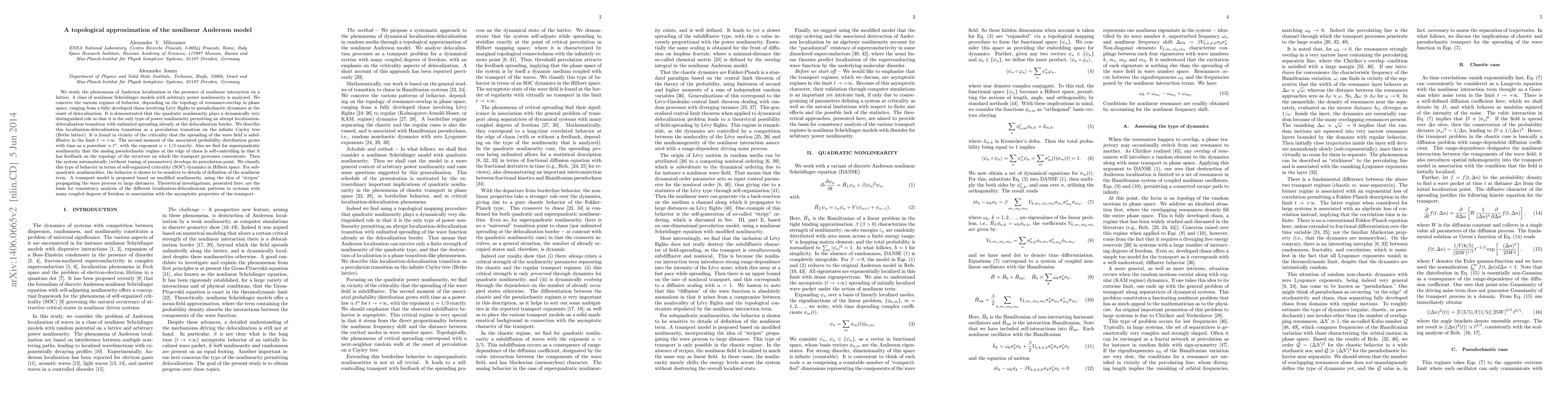 We study the phenomena of Anderson localization in the presence of nonlinear interaction on a lattice. A class of nonlinear Schrodinger models with arbitrary power nonlinearity is analyzed. We conceive the various regimes of behavior, depending on the topology of resonance-overlap in phase space, ranging from a fully developed chaos involving Levy flights to pseudochaotic dynamics at the onset of delocalization. It is demonstrated that quadratic nonlinearity plays a dynamically very distinguished role in that it is the only type of power nonlinearity permitting an abrupt localization-delocalization transition with unlimited spreading already at the delocalization border. We describe this localization-delocalization transition as a percolation transition on a Cayley tree. It is found in vicinity of the criticality that the spreading of the wave field is subdiffusive in the limit t\rightarrow+\infty. The second moment grows with time as a powerlaw t^\alpha, with \alpha = 1/3. Also we find for superquadratic nonlinearity that the analog pseudochaotic regime at the edge of chaos is self-controlling in that it has feedback on the topology of the structure on which the transport processes concentrate. Then the system automatically (without tuning of parameters) develops its percolation point. We classify this type of behavior in terms of self-organized criticality dynamics in Hilbert space. For subquadratic nonlinearities, the behavior is shown to be sensitive to details of definition of the nonlinear term. A transport model is proposed based on modified nonlinearity, using the idea of stripes propagating the wave process to large distances. Theoretical investigations, presented here, are the basis for consistency analysis of the different localization-delocalization patterns in systems with many coupled degrees of freedom in association with the asymptotic properties of the transport.