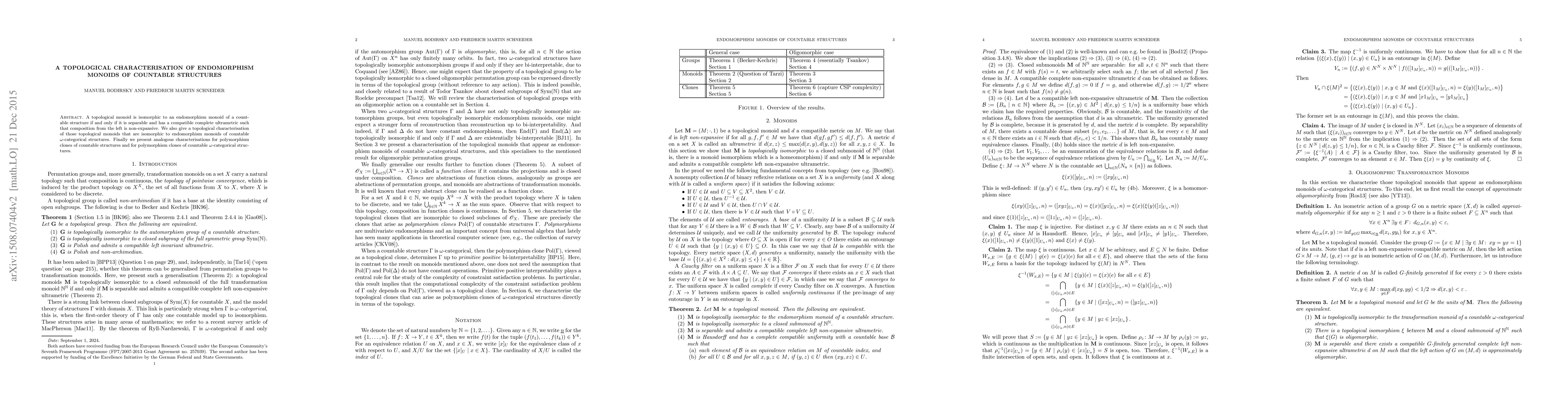 This paper provides a topological characterization of endomorphism monoids of countable structures, showing they are separable with a compatible ultrametric where left composition is non-expansive. It also extends this analysis to omega-categorical structures and their polymorphism clones.