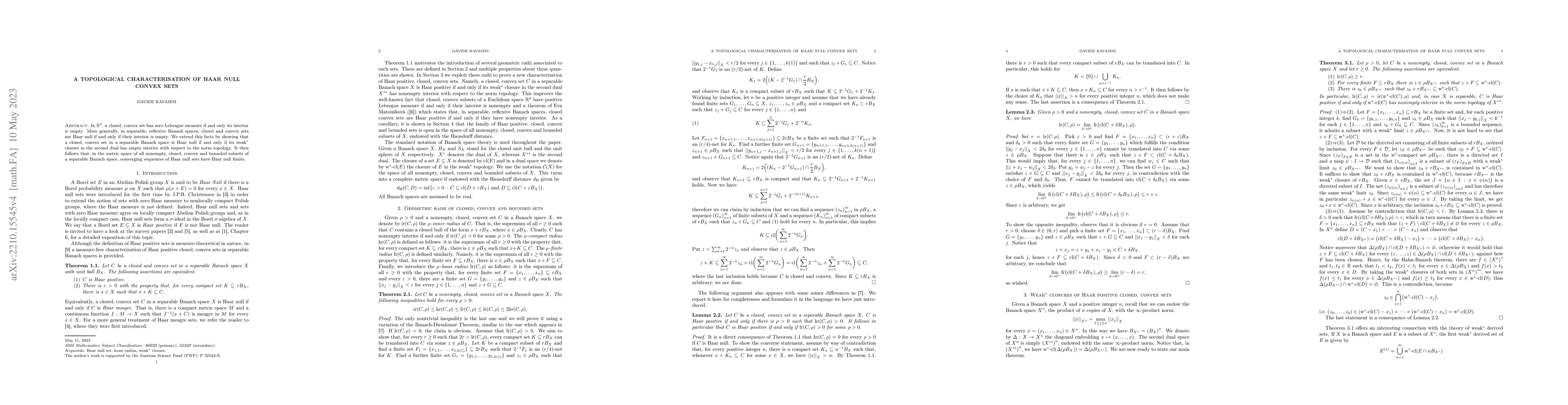 This paper extends the characterization of Haar null convex sets in separable Banach spaces, proving that such sets have empty interior in their weak$^*$ closure in the second dual. It concludes by showing that limits of converging sequences of Haar null sets remain Haar null.