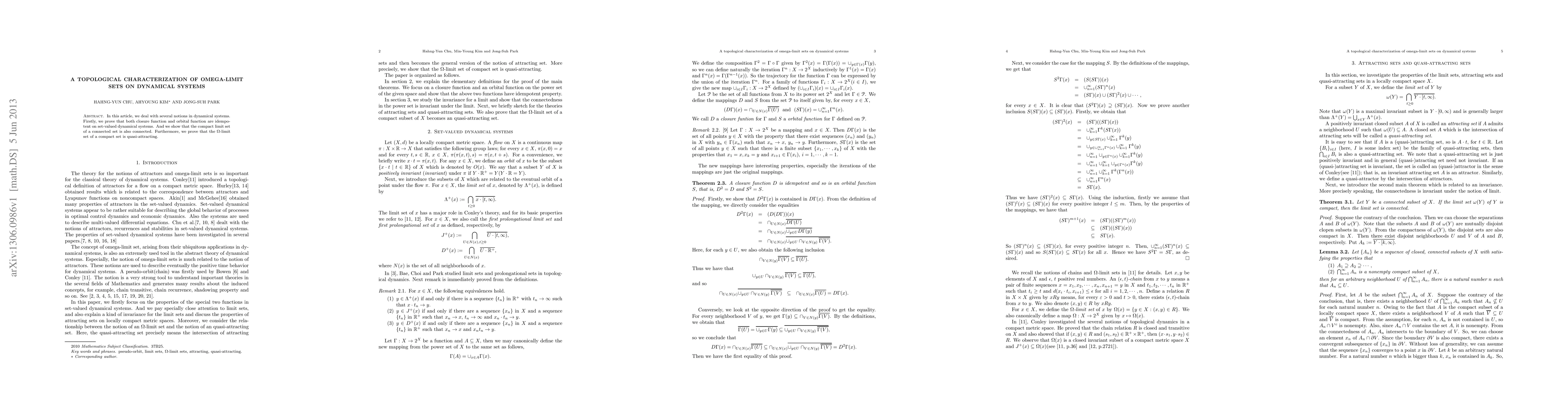 This paper characterizes omega-limit sets in dynamical systems by proving properties such as idempotence of closure function and orbital function, connectedness of compact limit sets, and quasi-attracting nature of compact set Omega-limit sets.