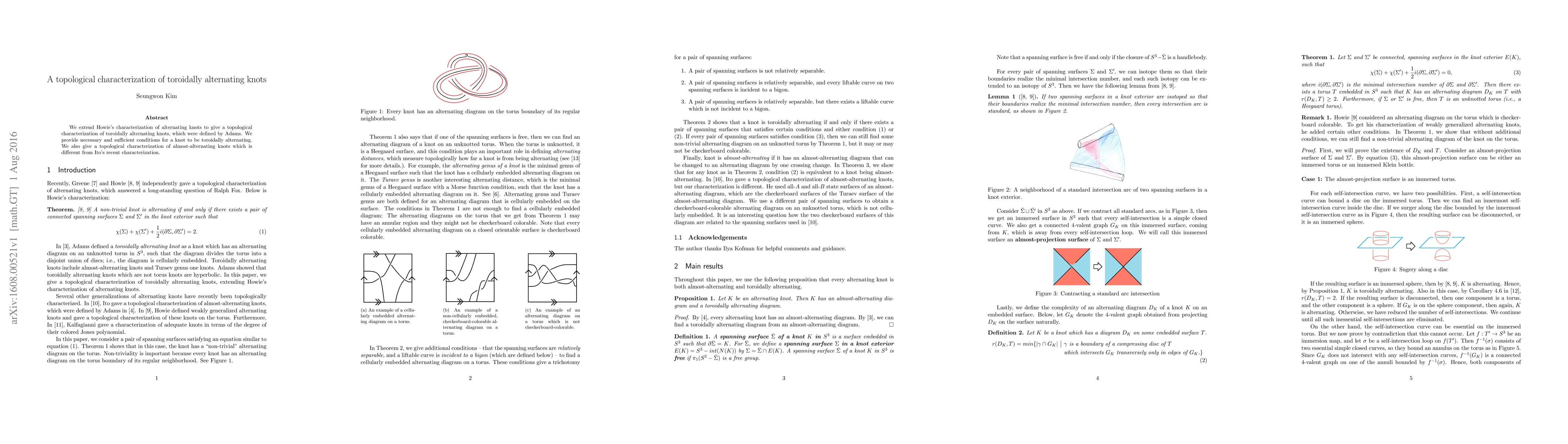 This paper characterizes toroidally alternating knots with necessary and sufficient conditions, providing a topological characterization that differs from existing characterizations of almost-alternating knots.