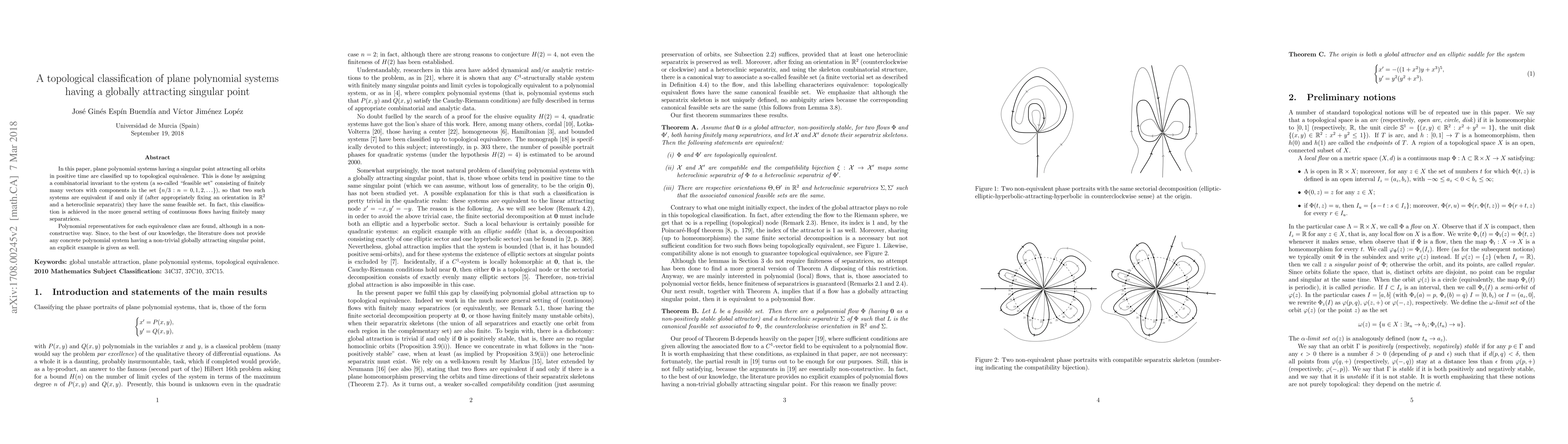 In this paper, plane polynomial systems having a singular point attracting all orbits in positive time are classified up to topological equivalence. This is done by assigning a combinatorial invariant to the system (a so-called "feasible set" consisting of finitely many vectors with components in the set $\{n/3: n=0,1,2,\ldots\}$), so that two such systems are equivalent if and only if (after appropriately fixing an orientation in $\mathbb{R}^2$ and a heteroclinic separatrix) they have the same feasible set. In fact, this classification is achieved in the more general setting of continuous flows having finitely many separatrices. Polynomial representatives for each equivalence class are found, although in a non-constructive way. Since, to the best of our knowledge, the literature does not provide any concrete polynomial system having a non-trivial globally attracting singular point, an explicit example is given as well.