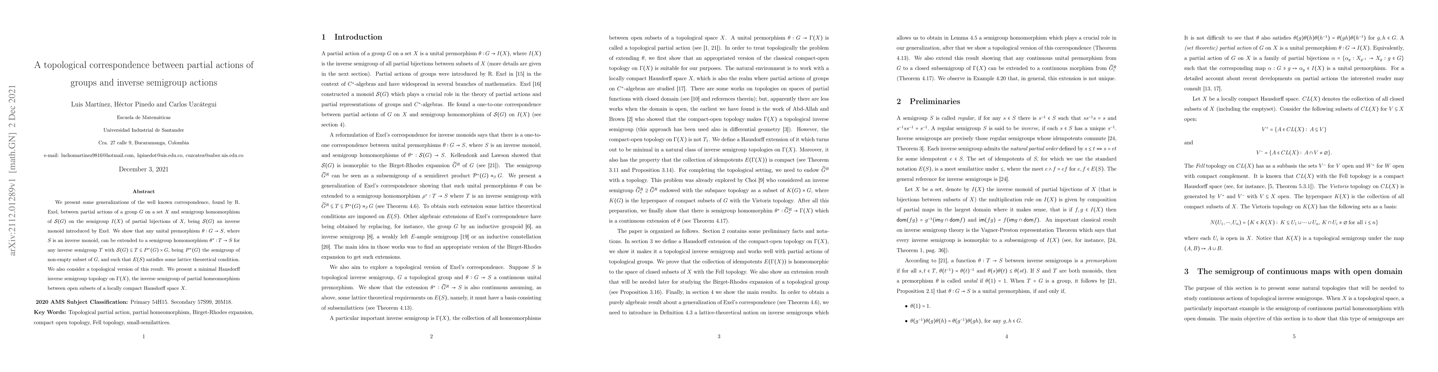 We present some generalizations of the well-known correspondence, found by R. Exel, between partial actions of a group $G$ on a set $X$ and semigroup homomorphism of $S(G)$ on the semigroup $I(X)$ of partial bijections of $X,$ being $S(G)$ an inverse monoid introduced by Exel. We show that any unital premorphism $\theta:G\to S$, where $S$ is an inverse monoid, can be extended to a semigroup homomorphism $\theta^*:T\to S$ for any inverse semigroup $T$ with $S(G)\subseteq T\subseteq P^*(G)\times G,$ being $P^*(G)$ the semigroup of non-empty subset of $G$, and such that $E(S)$ satisfies some lattice theoretical condition. We also consider a topological version of this result. We present a minimal Hausdorff inverse semigroup topology on $\Gamma(X)$, the inverse semigroup of partial homeomorphism between open subsets of a locally compact Hausdorff space $X$.