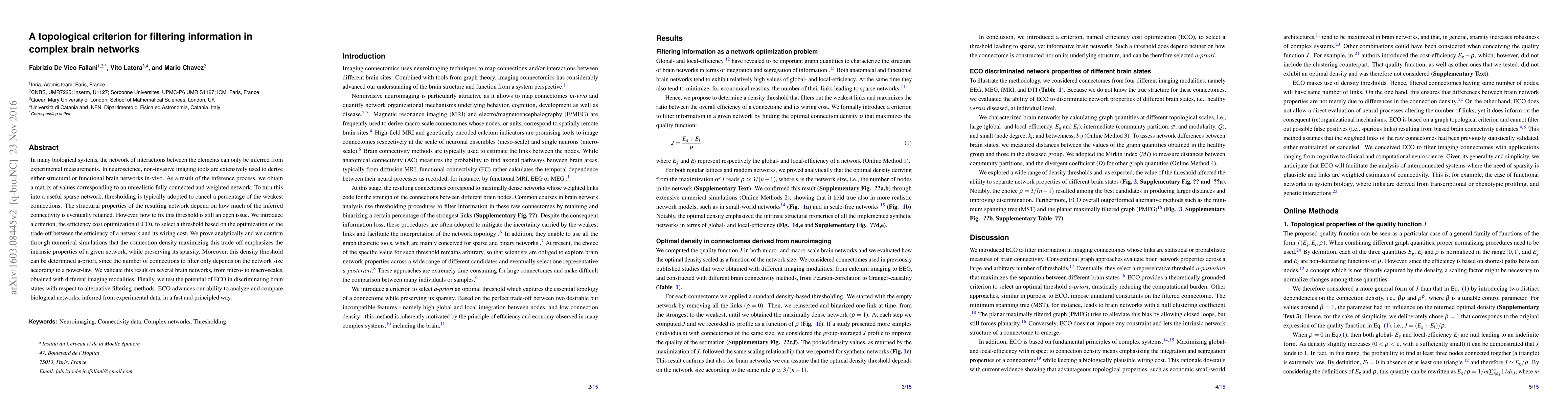 This research introduces the Efficiency Cost Optimization (ECO) criterion to determine an optimal threshold for filtering connections in brain networks inferred from experimental data. ECO balances network efficiency and wiring cost, preserving the network's intrinsic properties while maintaining sparsity. The method is validated across various brain networks from different imaging modalities and scales, and it demonstrates potential in distinguishing brain states from alternative filtering techniques, advancing the analysis and comparison of biological networks.