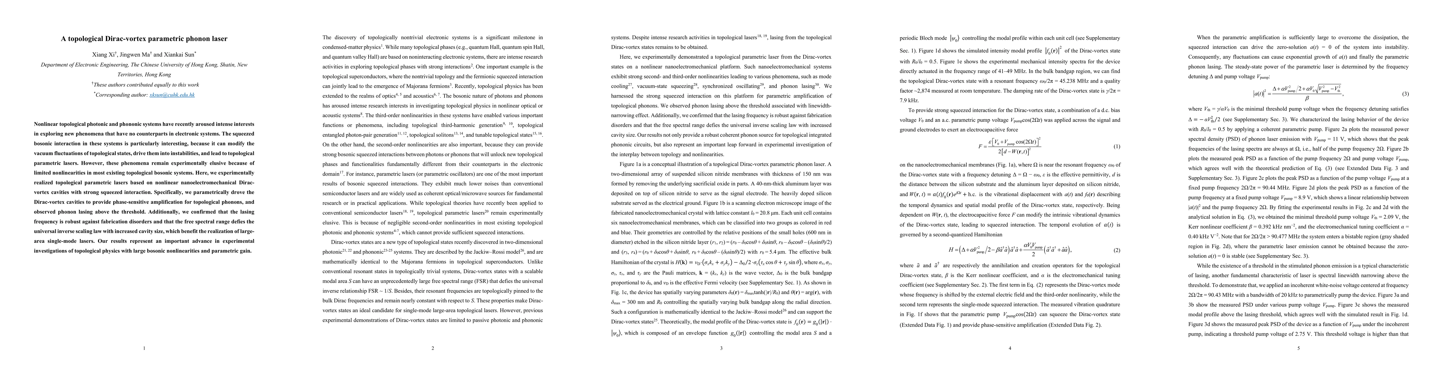 This paper experimentally demonstrates the first topological parametric phonon laser using nonlinear nanoelectromechanical Dirac-vortex cavities, achieving robust phonon lasing above threshold and showing a free spectral range that defies conventional scaling laws. The results advance the study of topological physics with significant bosonic nonlinearities and parametric gain.