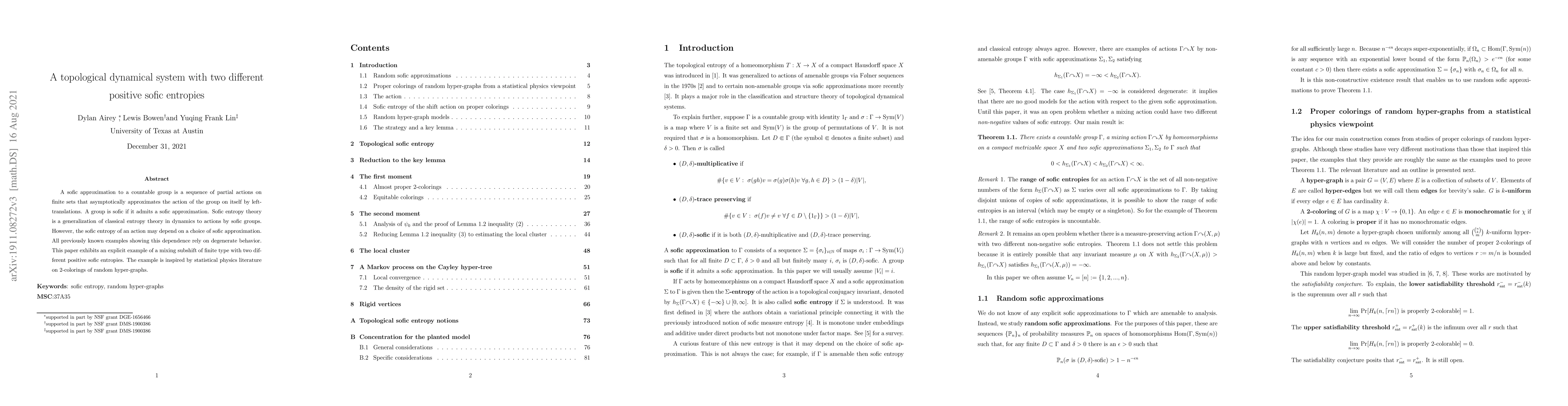 This paper presents an explicit example of a mixing subshift of finite type demonstrating two distinct positive sofic entropies, challenging prior reliance on degenerate behavior. The example draws inspiration from statistical physics concerning 2-colorings of random hyper-graphs.