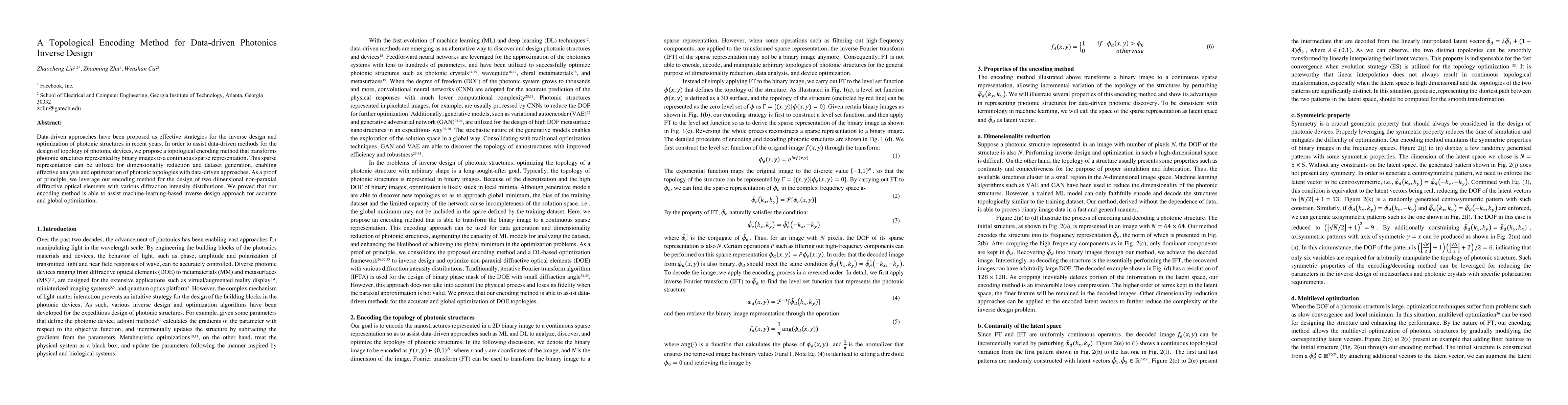This paper proposes a topological encoding method to transform binary images of photonic structures into a continuous sparse representation, facilitating dimensionality reduction and dataset generation. The method is demonstrated to effectively assist machine-learning-based inverse design for optimizing two-dimensional non-paraxial diffractive optical elements.