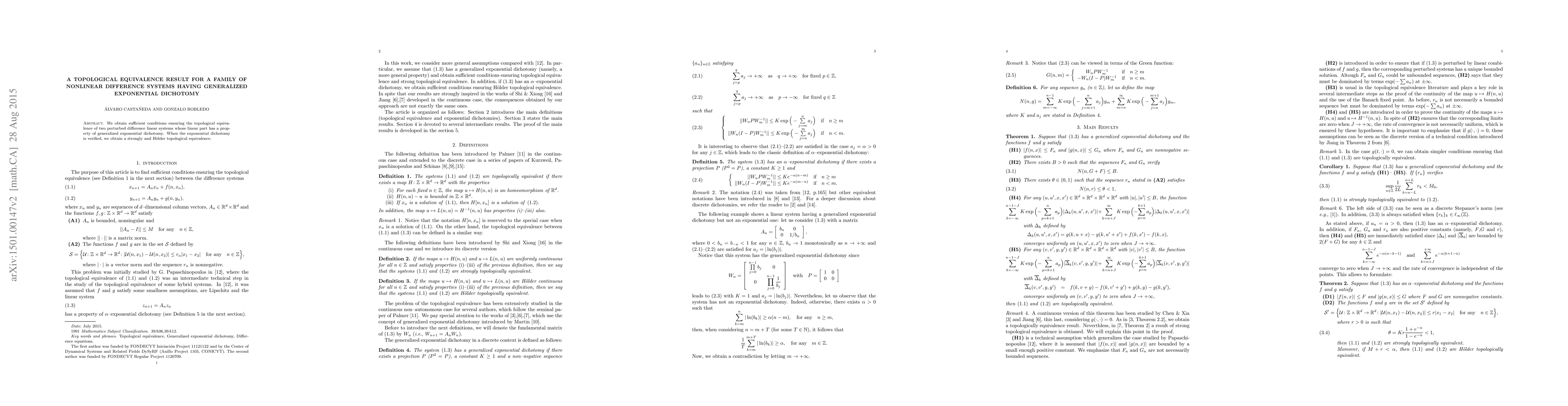 We obtain sufficient conditions ensuring the topological equivalence of two perturbed difference linear systems whose linear part has a property of generalized exponential dichotomy. When the exponential dichotomy is verified, we obtain a strongly and H\"older topological equivalence.